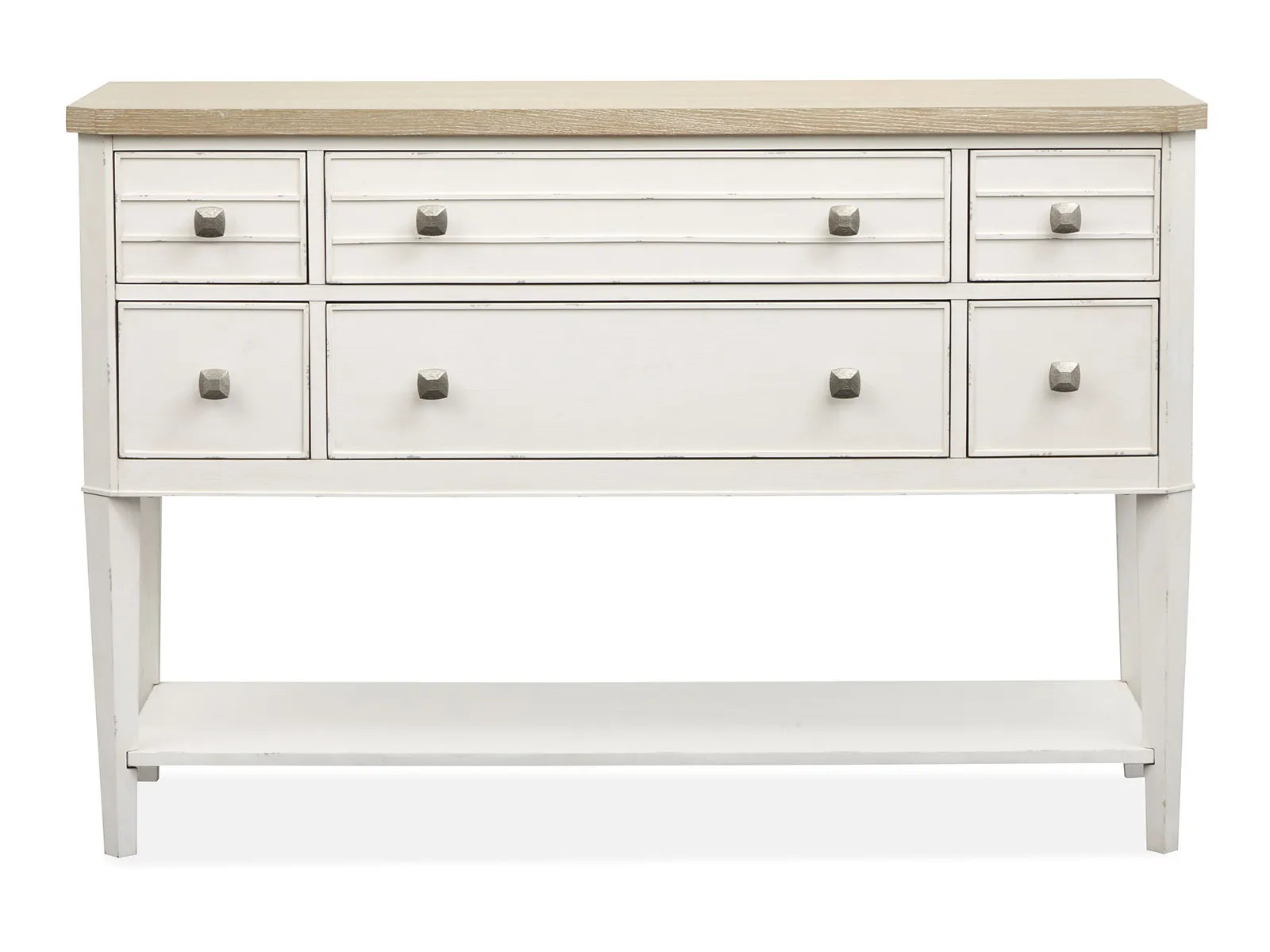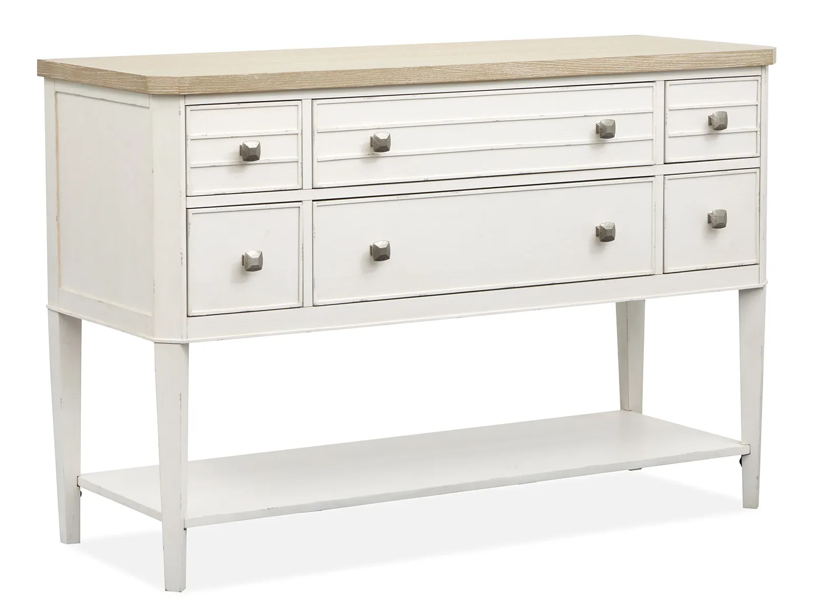 The Echo Isles Collection brings together a perfect blend of transitional casual style with its serene Sea Pearl and Driftwood finishes. Crafted with quartered oak tops and casual chippy white undertop surfaces and the collection's casegoods feature modern raised beads and concentric squares and and canted posts and aprons and adding dimension and visual interest. The sculpted and textured Satin Silver hardware provides a subtle shine and enhancing the collection's relaxed yet refined aesthetic. The versatile pieces and including several bedroom and living options and offer flexibility for various rooms of the home and making the Echo Isles Collection ideal for creating a welcoming and functional space. With its inviting finish and thoughtful design details and this collection will bring a calm and coastal charm to your home and effortlessly elevating any room.