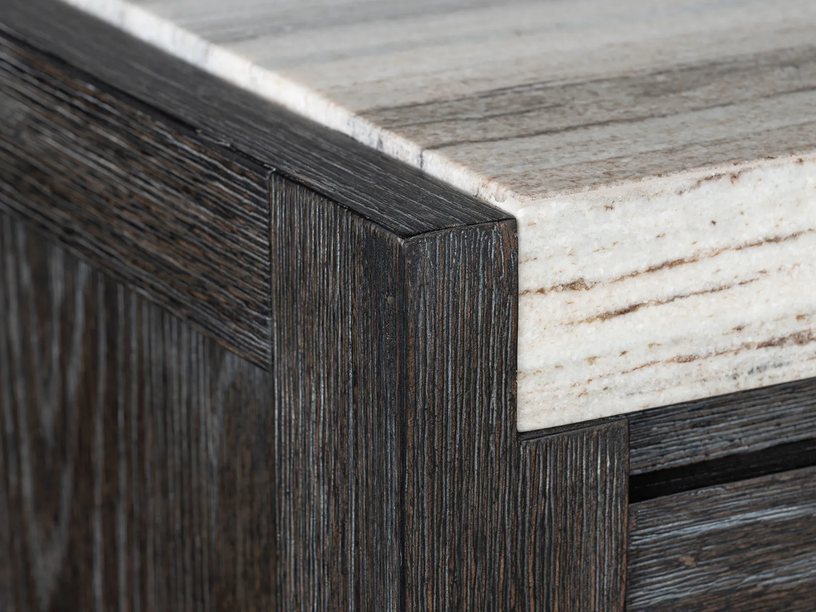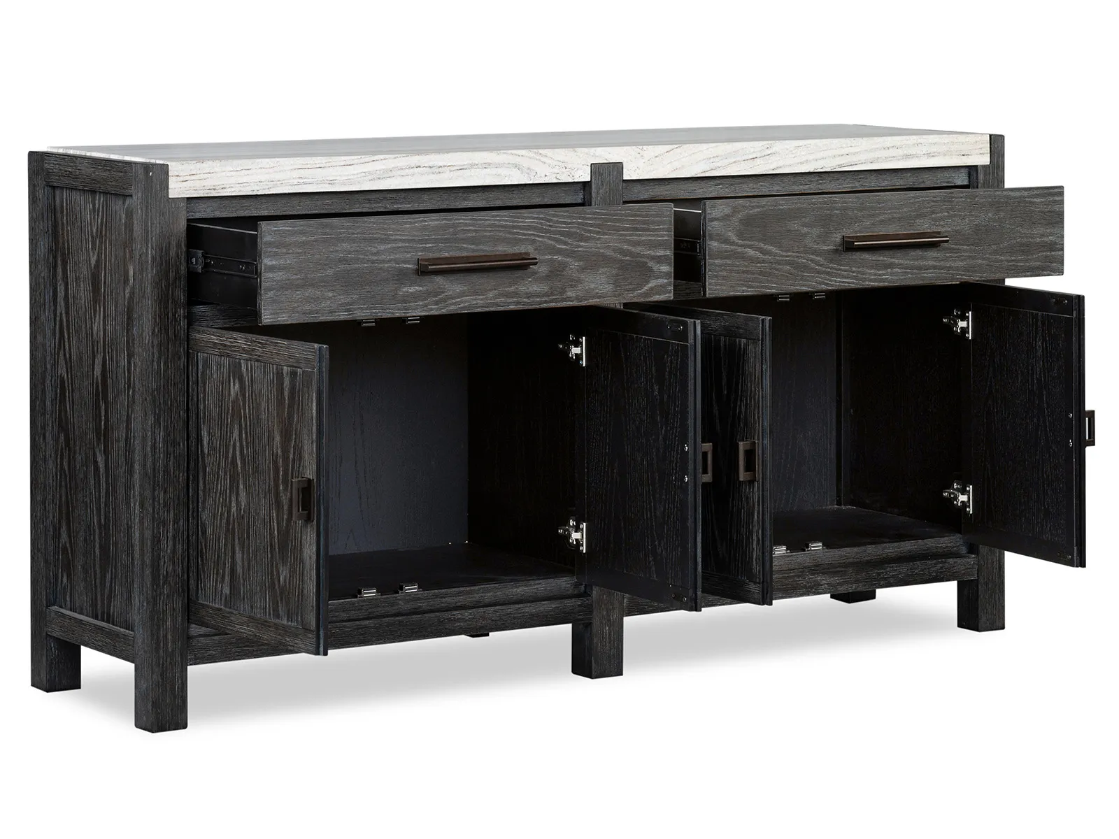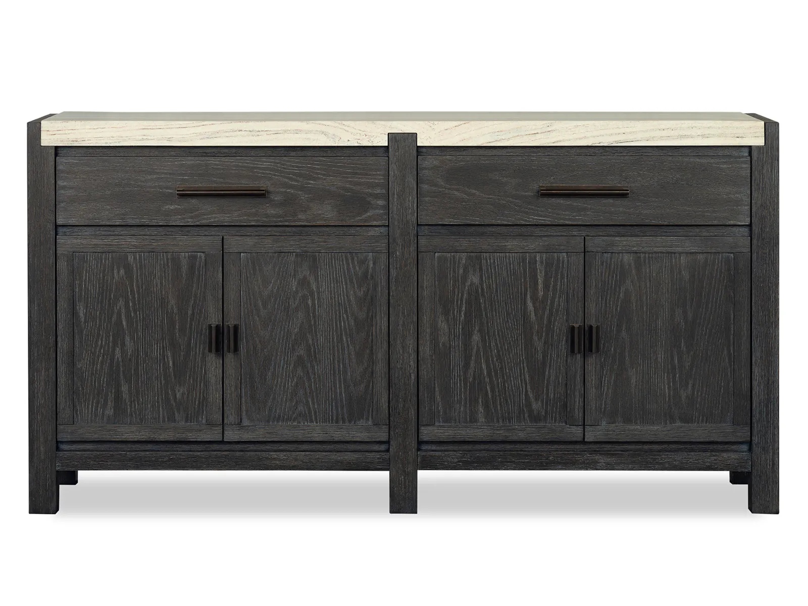 The Plum Creek Collection brings a serene and seasonless style to your dining room and combining natural beauty with subtle sophistication. Finished in a soft Raenwood Black and complemented by Oil Rubbed Bronze hardware and the collection blends Random Cathedral and Slip/Flip White Oak Veneer and hardwood solids and stone and and fabric for a warm and inviting look. The feature smooth lines and gentle curves and while the notched stone detailing adds an element of texture and interest. The Plum Creek Collection brings timeless charm to any home and offering a perfect balance of understated elegance and effortless warmth.