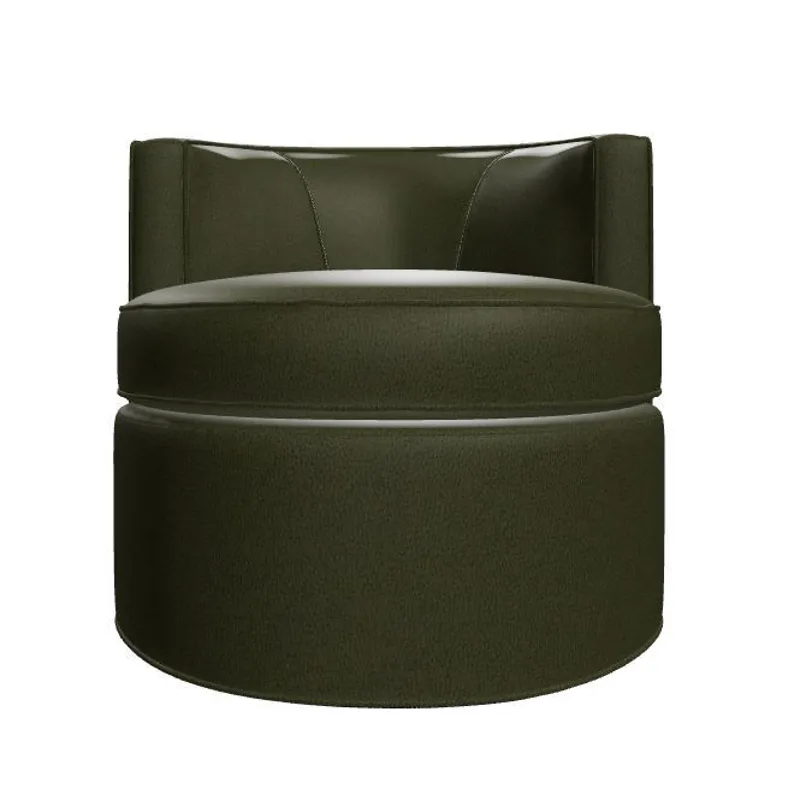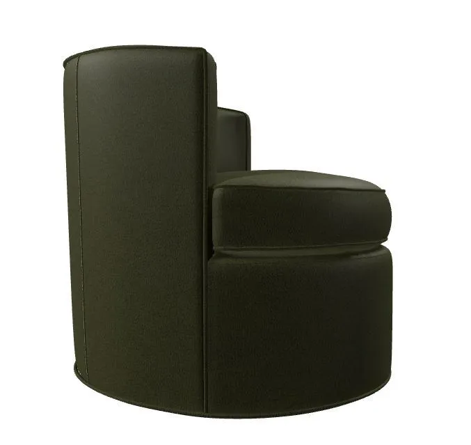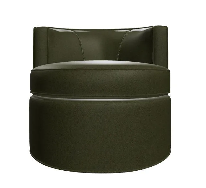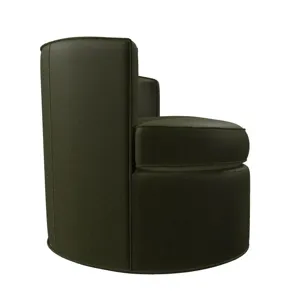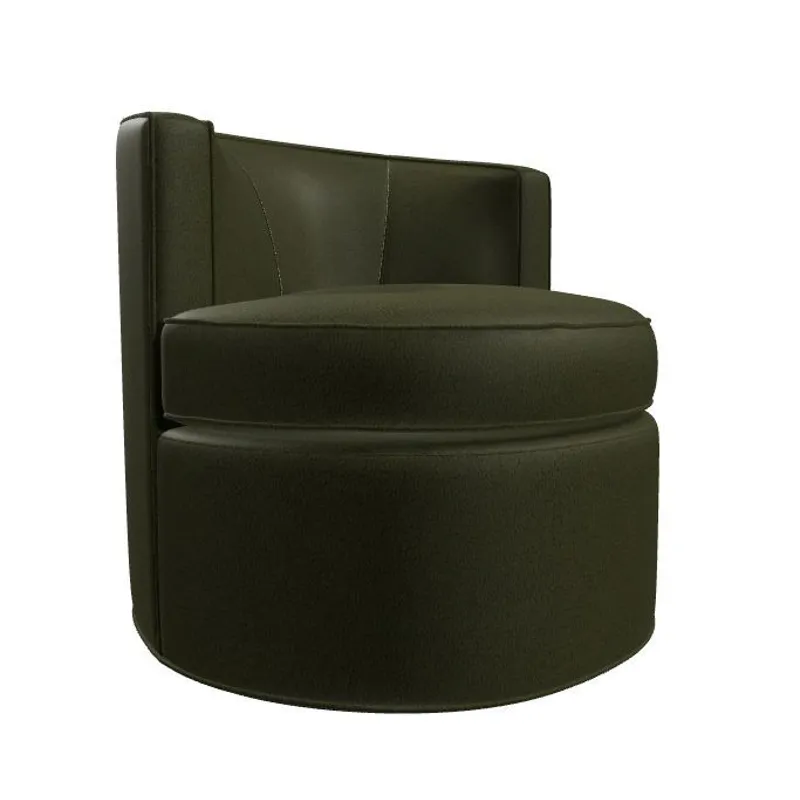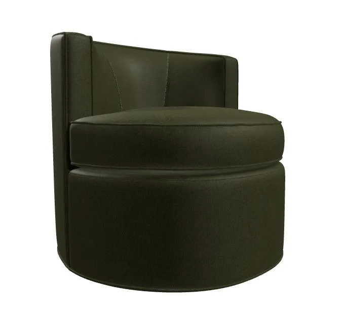 This leather swivel chair stands out in a crowd with its circular shape and modern aesthetic. It features a contoured Blend Down seat cushion and bordered welted back. Small in scale, this chair is even better when shown in pairs. Also available in fabric- see style 042610BDSC