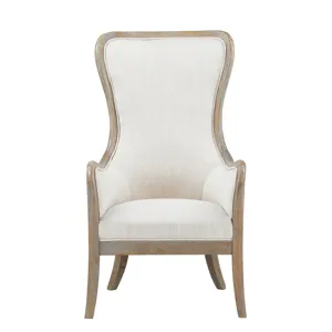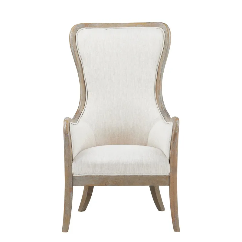 Cleveland Chair (French Linen) - This chair has graceful lines but makes a bold statement, the Cleveland armchair features a distressed honey pecan finish and is tailored nicely with a beautiful neutral French linen fabric. It's high back with its subtle wing back and curved arms give it a stunning soft and timeless look.Â