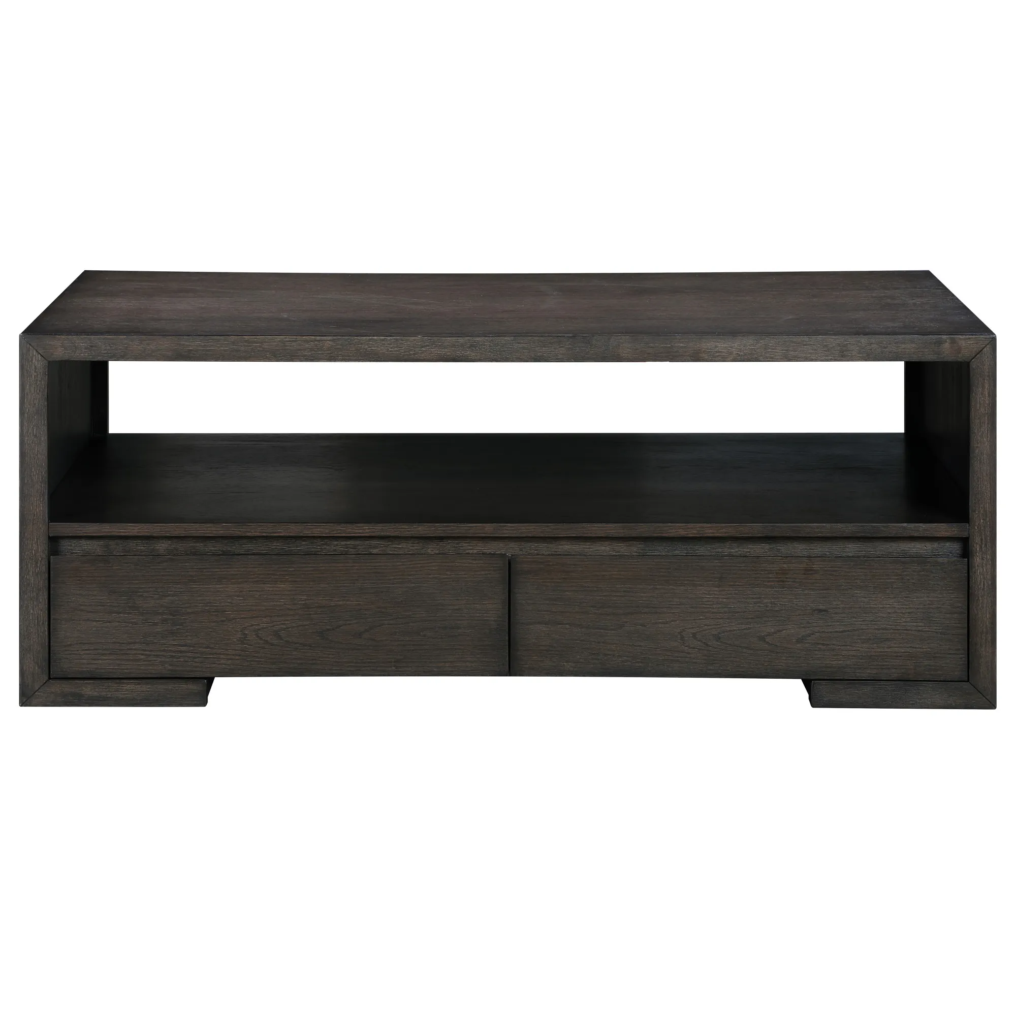 The 48" Evan Coffee Table features a clean, minimalist design with a walnut finish over oak veneers. Its hardware-free exterior and spacious bottom shelf provide organized space, while two drawers offer a great place for additional organization. With its modern style and ample surface area, this coffee table is the perfect centerpiece for your living room, complementing your sofa or loveseat while offering both style and functionality.