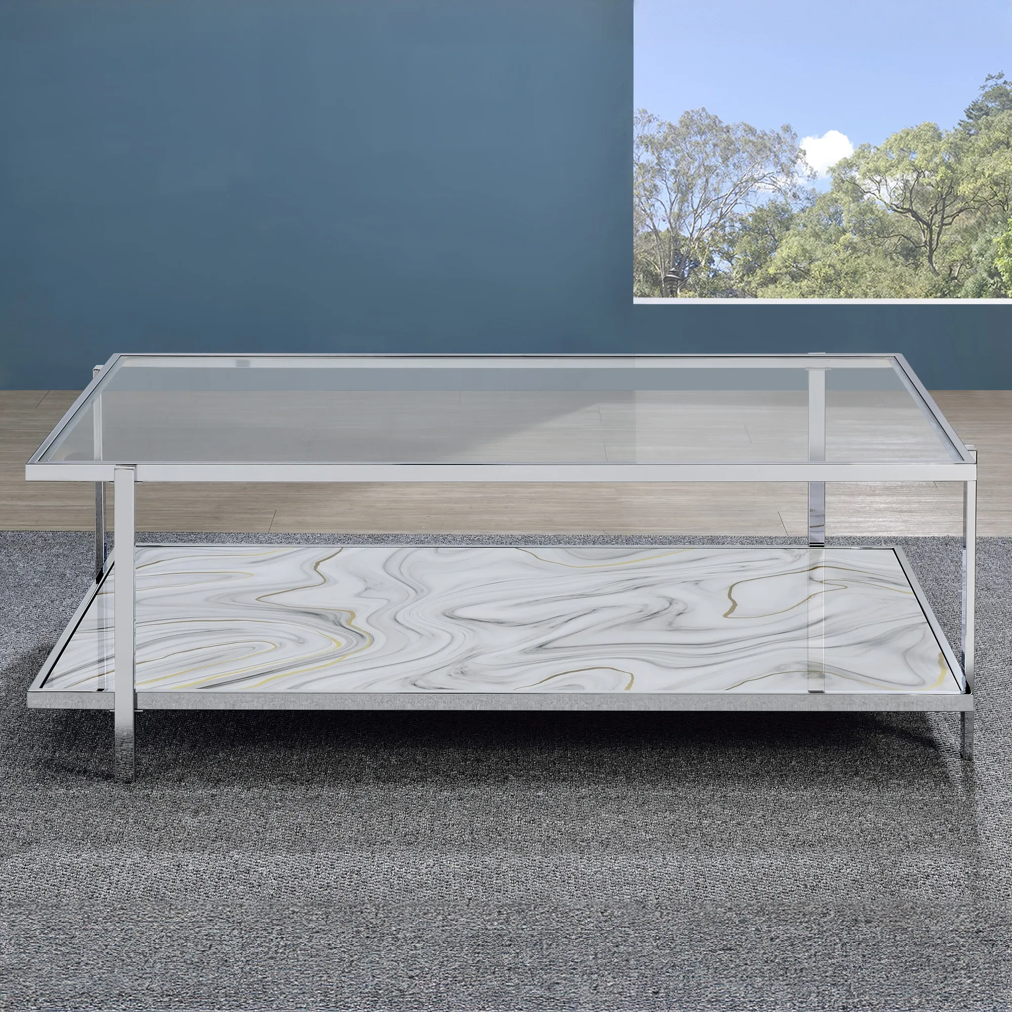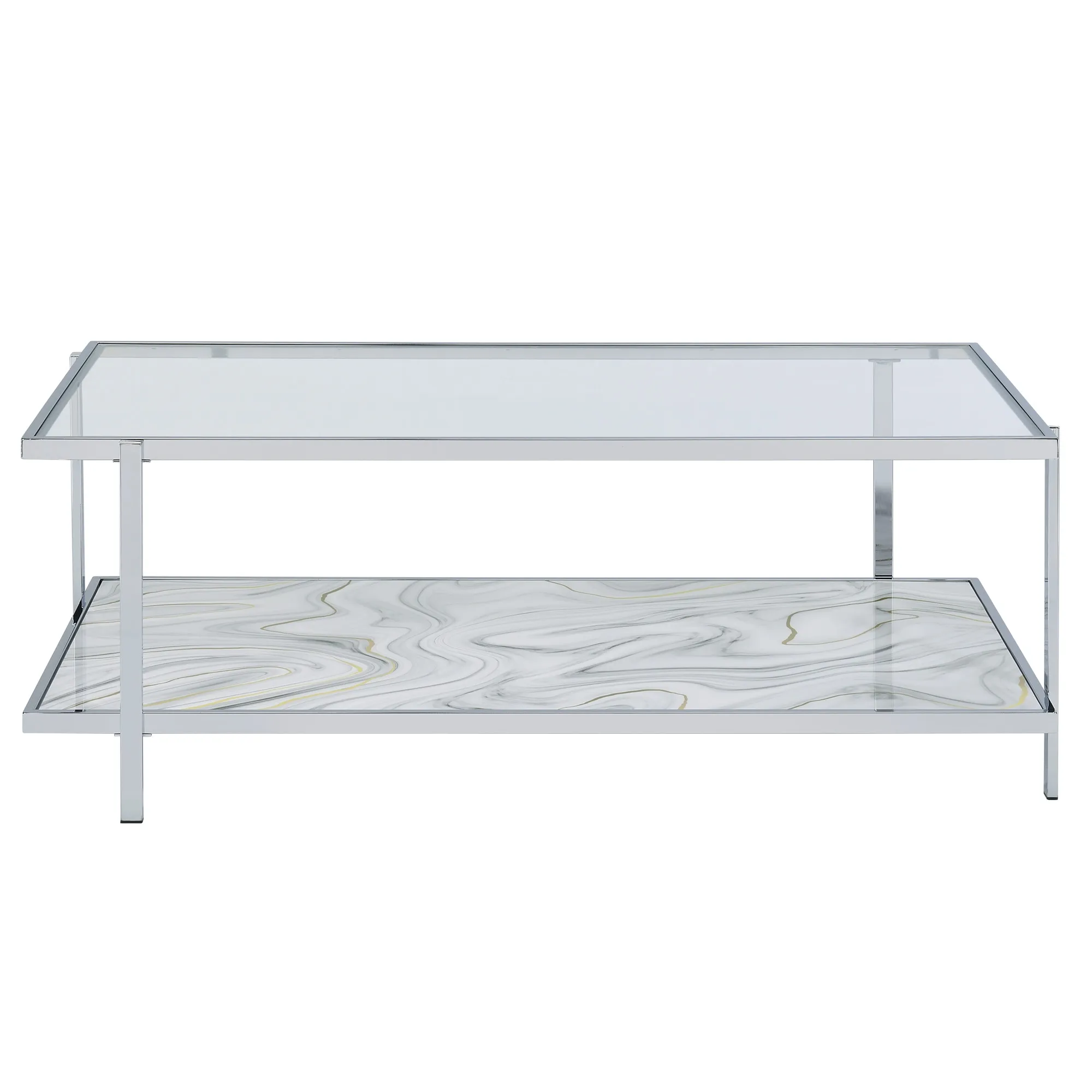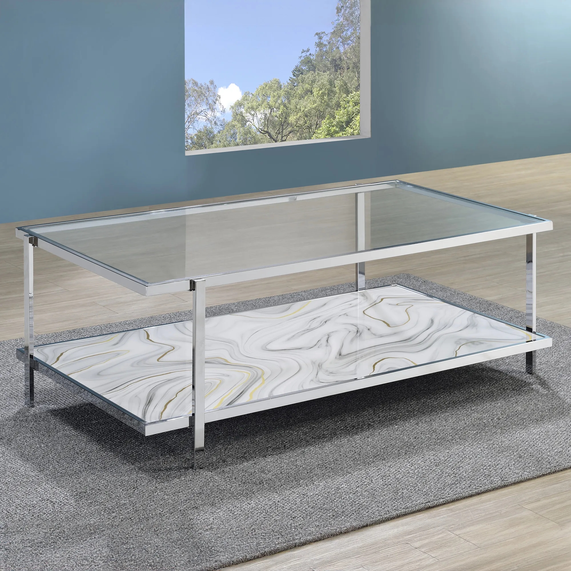 The Mika Coffee Table introduces a captivating blend of gray, bronze and yellow hues in a stylized faux-stone finish, becoming the centerpiece of your living room. Chrome and glass combine with an Art Deco swirled base to create a sparkling and enticing piece. This table enhances other accent colors in the room and features a bottom shelf, making it perfect for storage or display in your main living area.