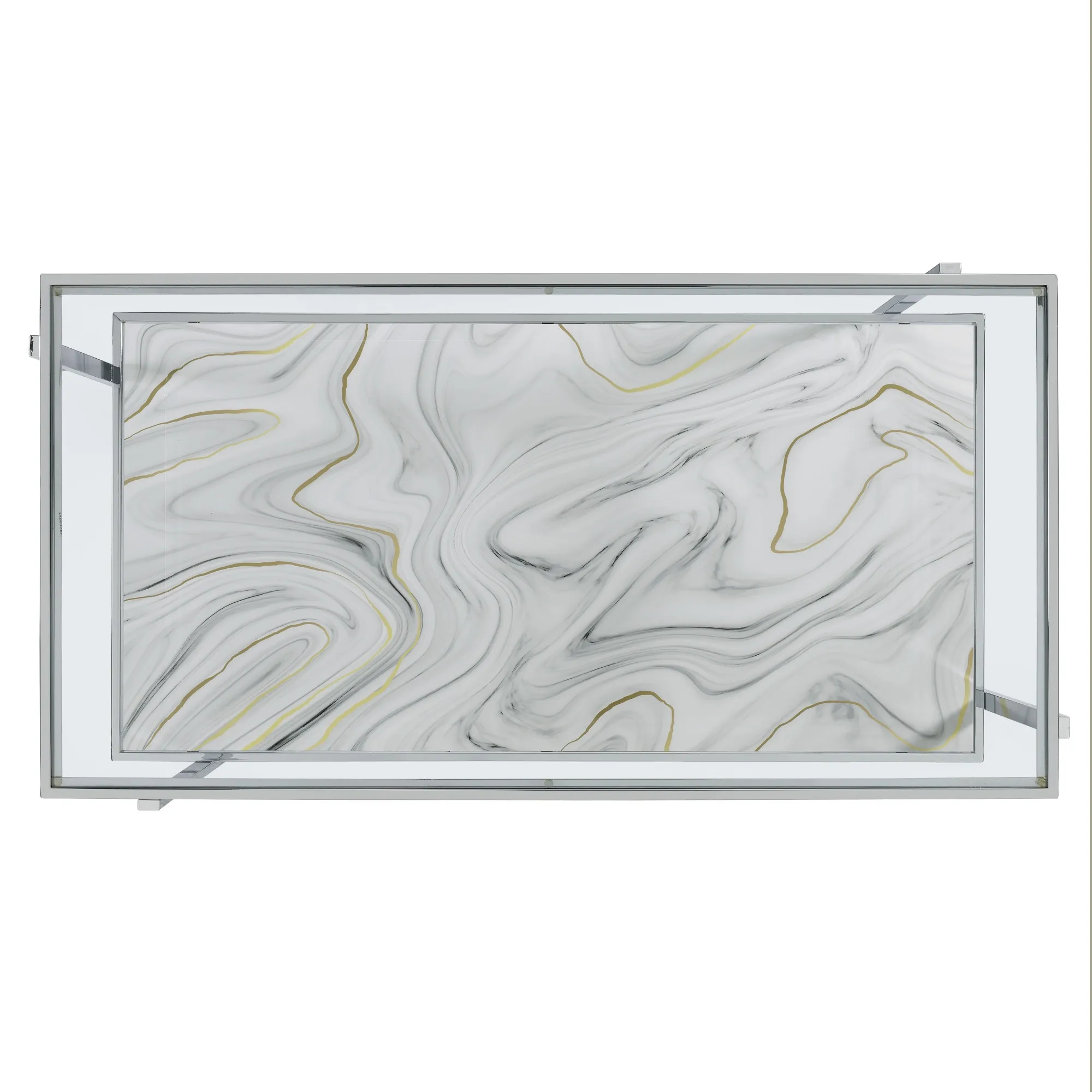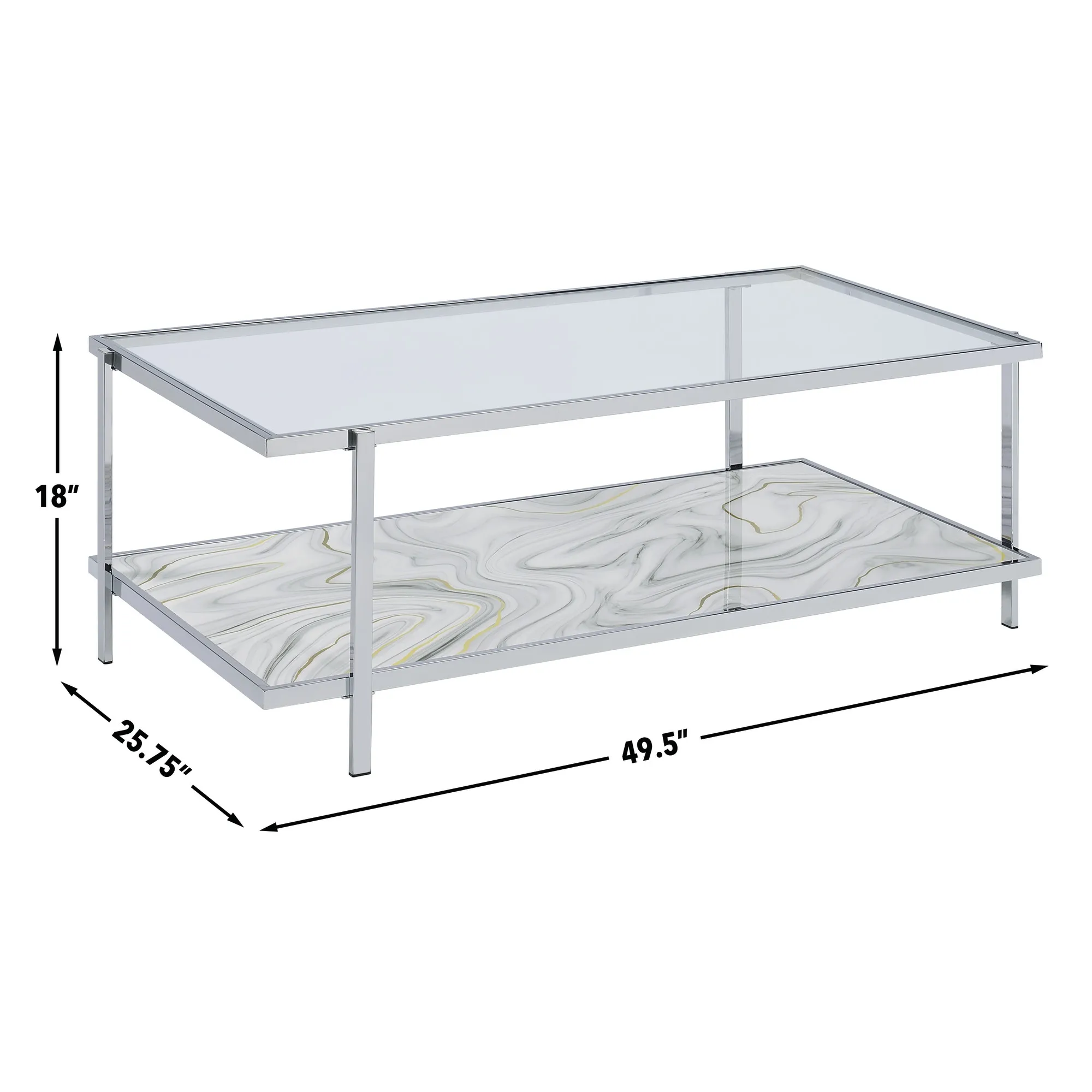 - Crafted of tempered glass, printed paper veneers, engineered woods and chrome plated iron