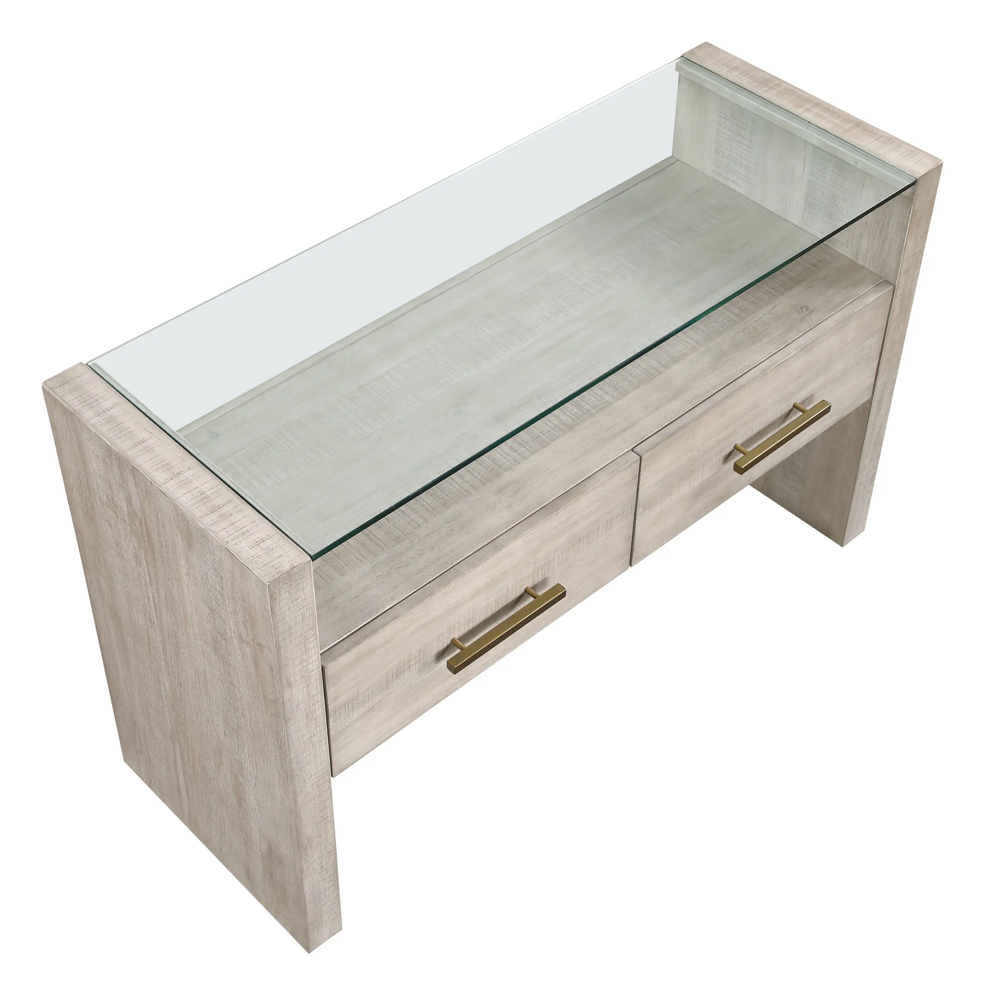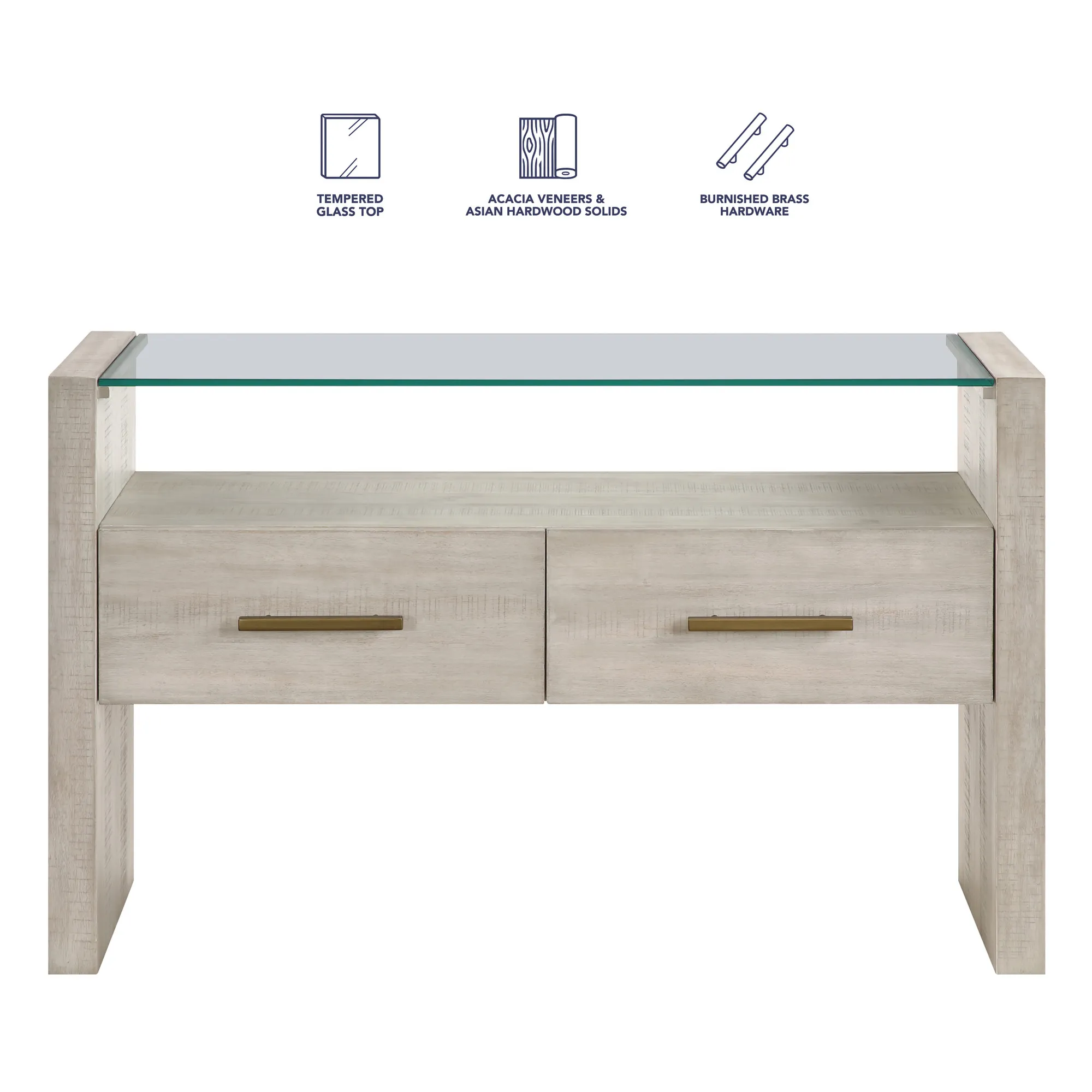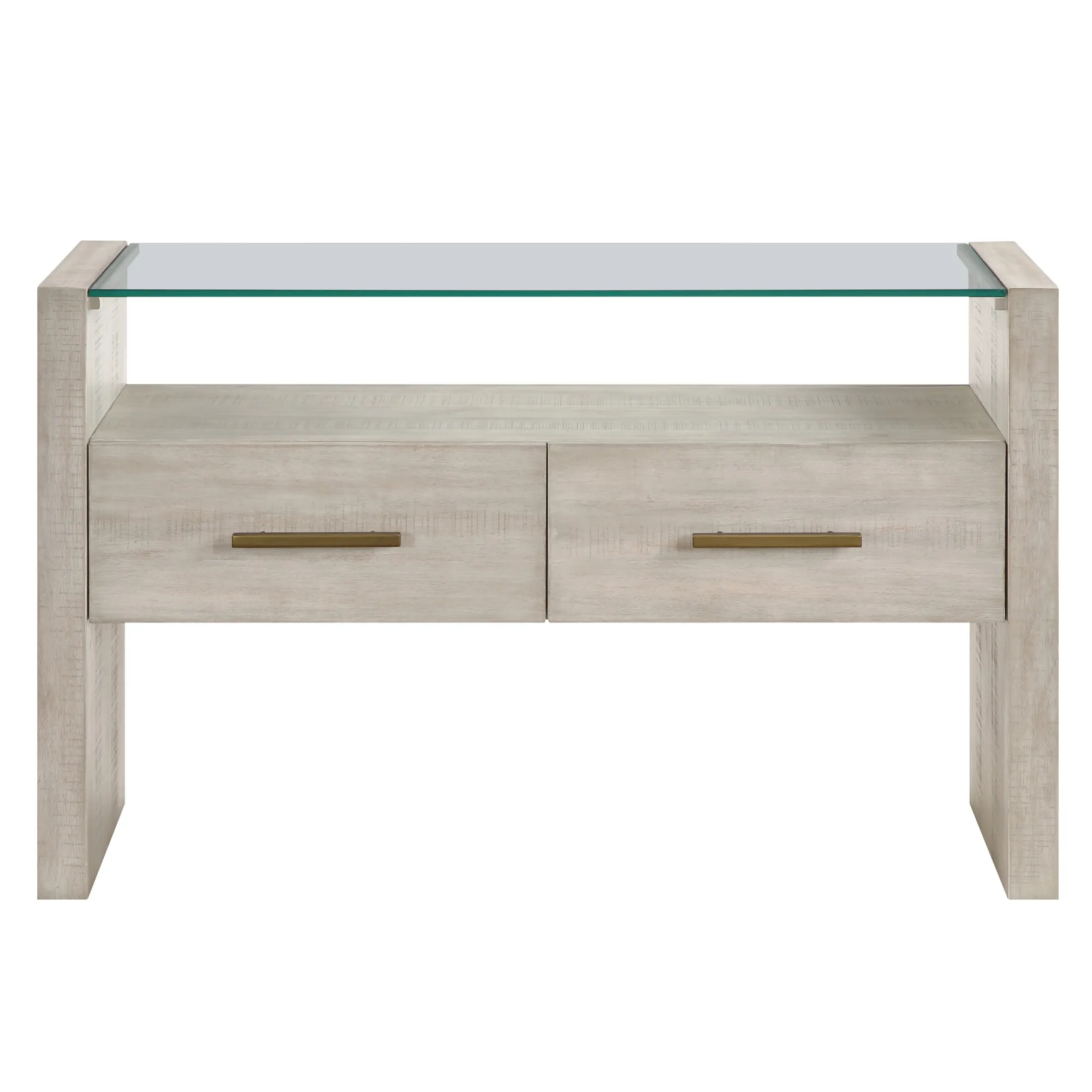 The Garland Sofa Table combines style and function in a compact design. Featuring a glass top and an open shelf underneath, it offers a sleek, modern look while providing practical storage with a lustrous distressed washed parchment finish.