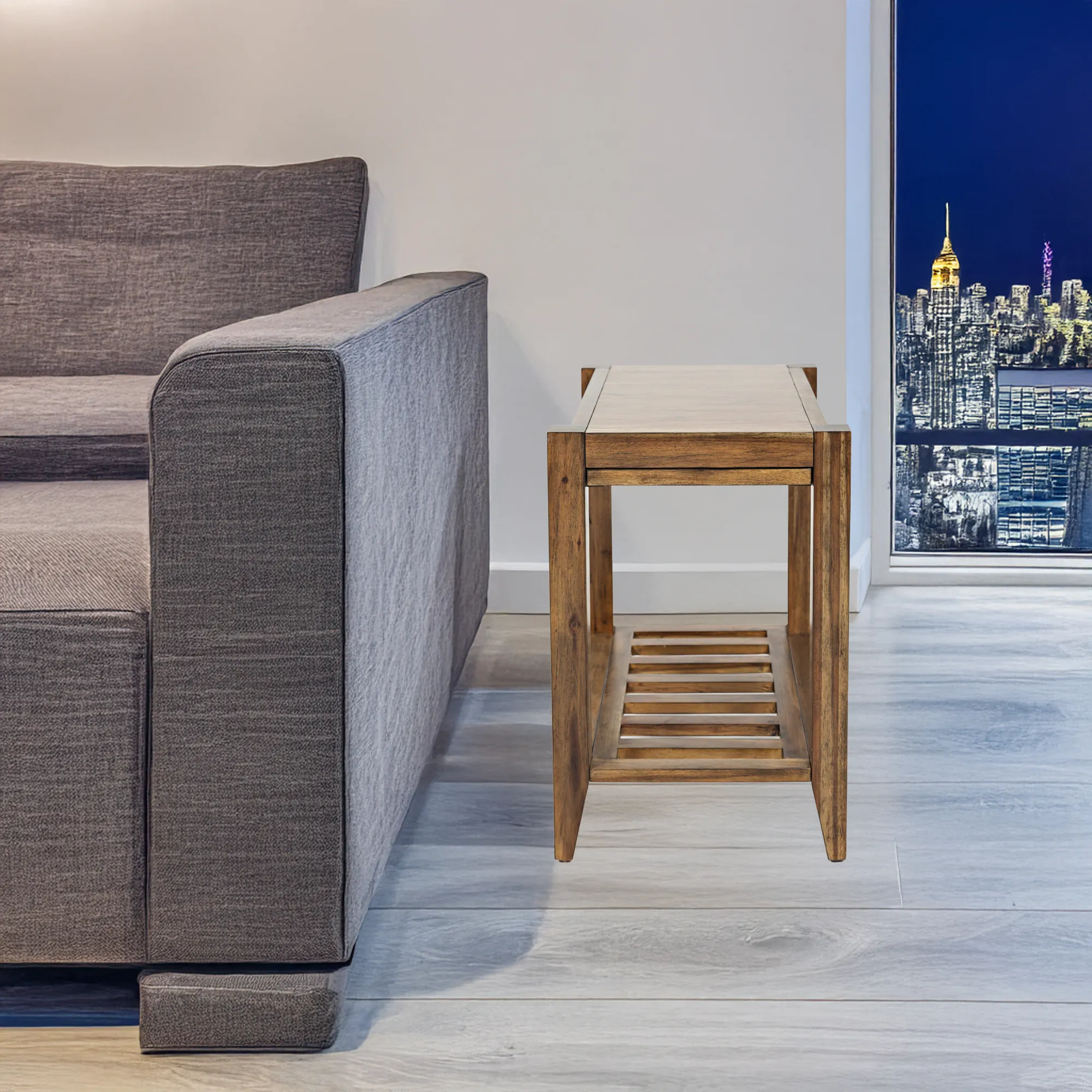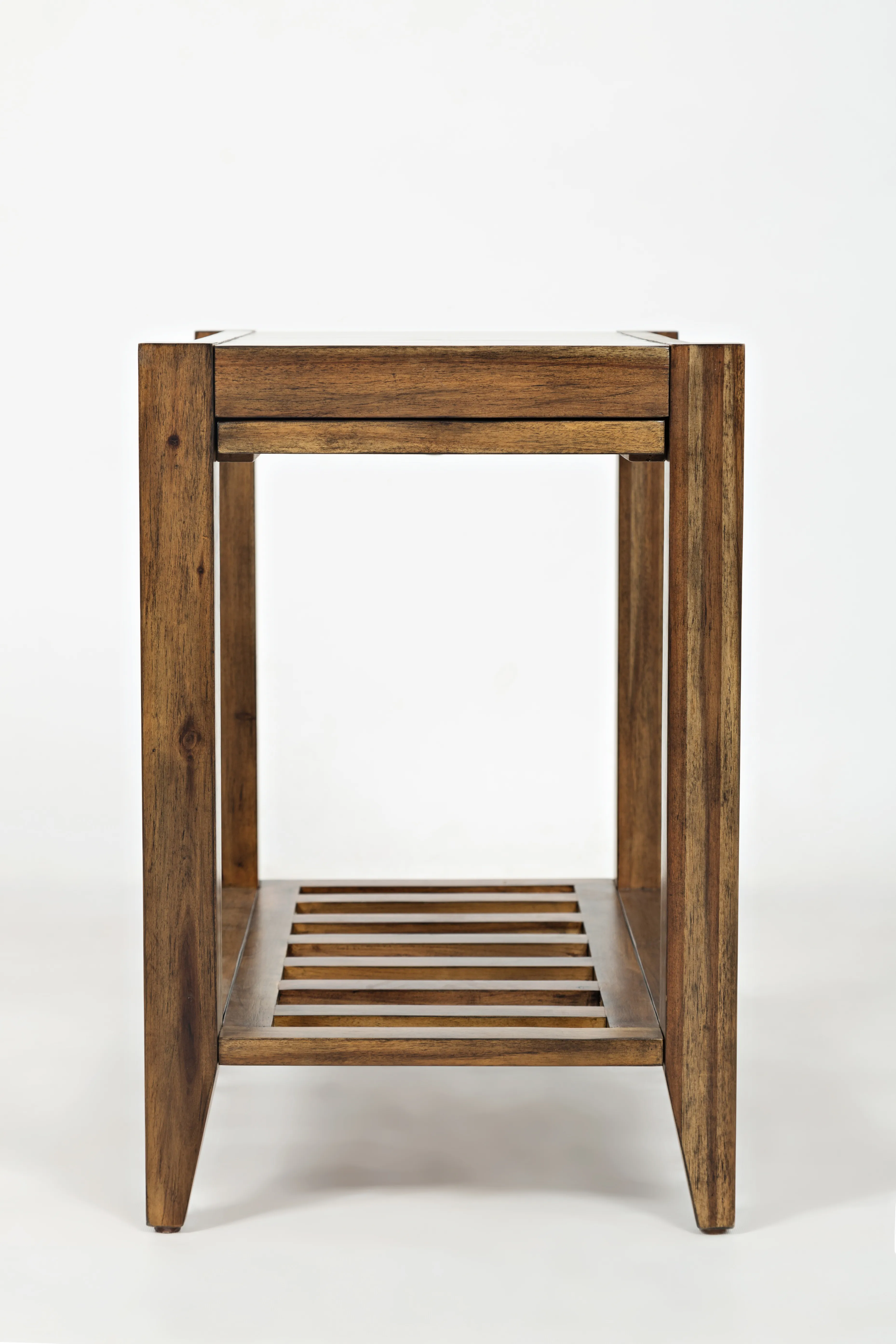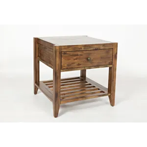 Enhance your living space with the Beacon Street Chairside End Table, a distinguished member of the Beacon Street occasional group. This table features a warm, solid wood finish that complements any decor. It includes a practical shelf for storage and a unique hidden pull-out shelf in the tabletop, perfect for holding drinks or remotes. The slat details on the shelf add a stylish touch, blending functionality with modern elegance. Ideal for placement next to a chair or sofa, this end table combines convenience with timeless charm.