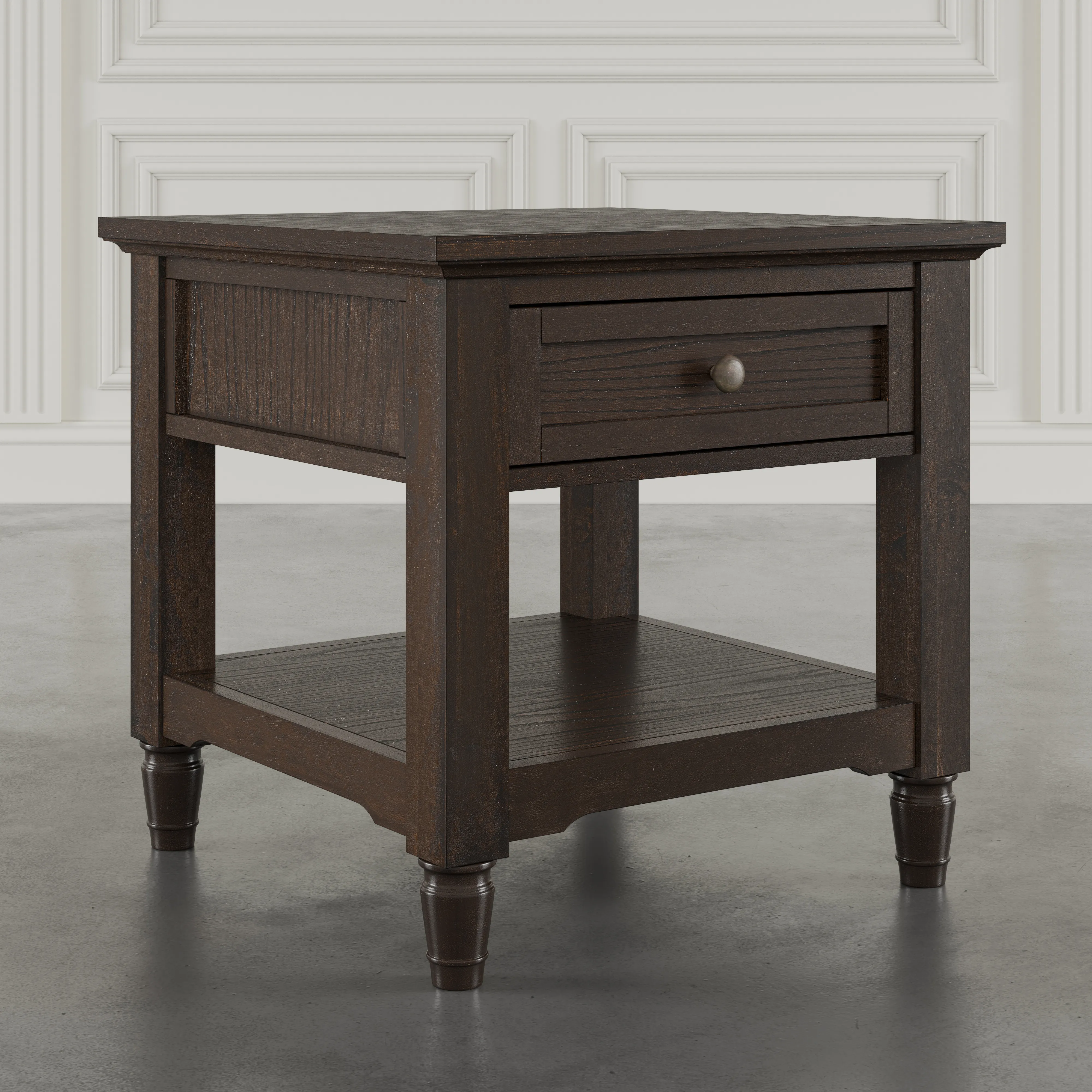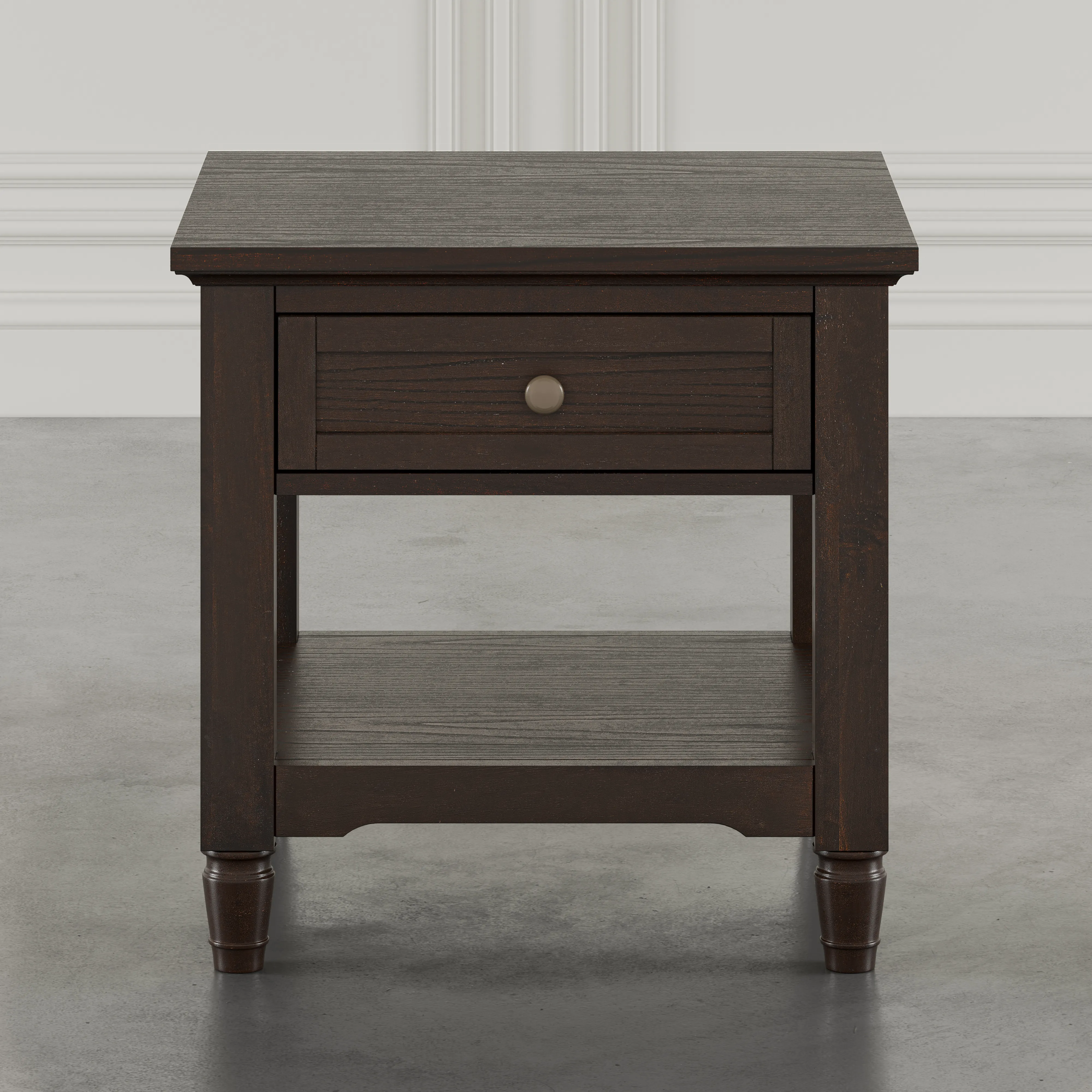 Brentwood Modern Transitional 24" Square End Table with Drawer and Storage Shelf combines traditional character with modern versatility, crafted from rubberwood and veneer for a look that is refined yet durable. Its compact scale makes it perfect for use beside a sofa, chair, or bed, offering a surface for lighting, decor, or everyday essentials. Classic design notes such as clean lines, subtle molding, and well-proportioned legs give it transitional appeal, allowing it to pair easily with a range of interior styles. The finish highlights the natural beauty of the wood while maintaining a polished modern edge. Equally suited for casual family spaces or more formal rooms, Brentwood Modern Transitional 24" Square End Table with Drawer and Storage Shelf provides both style and function in a versatile silhouette.