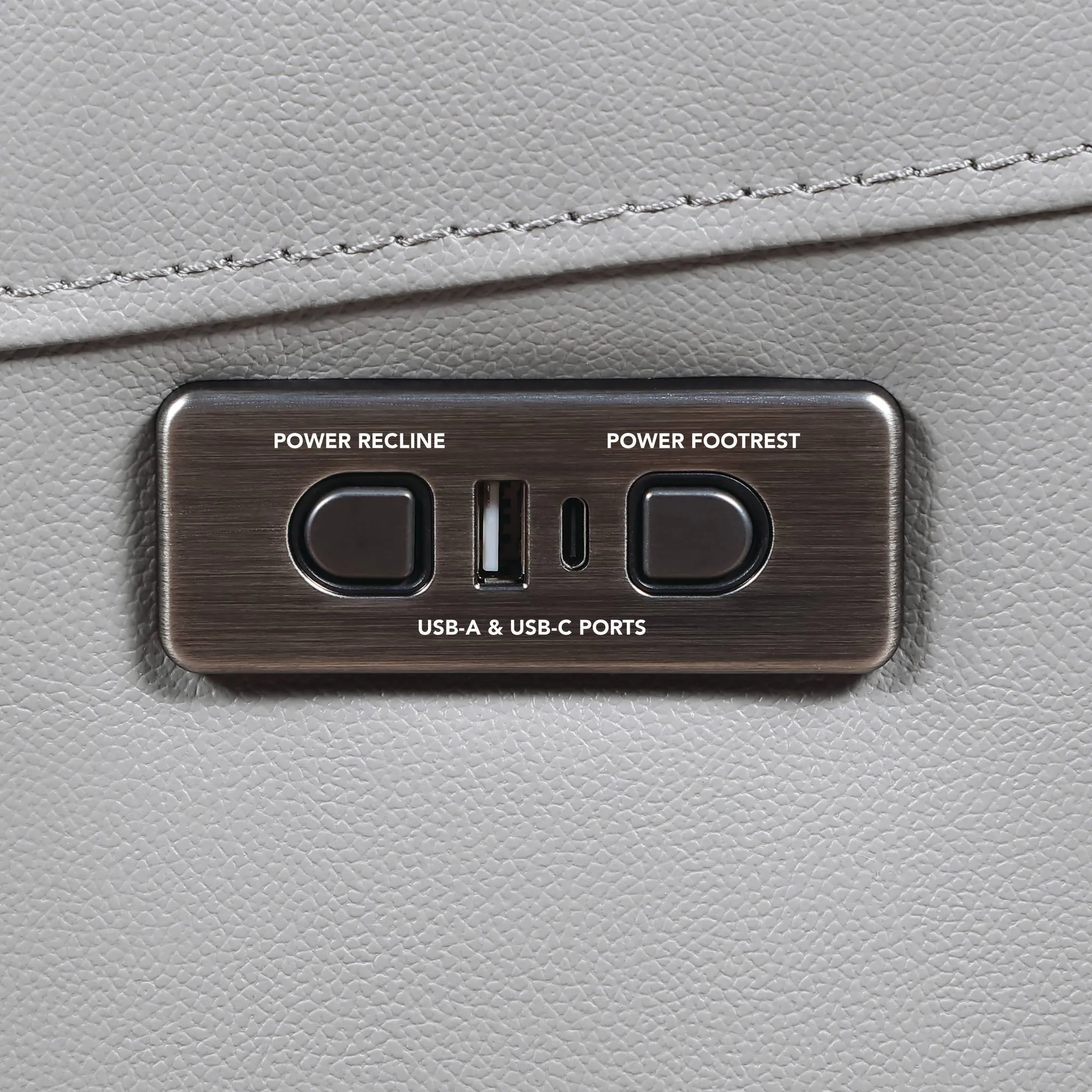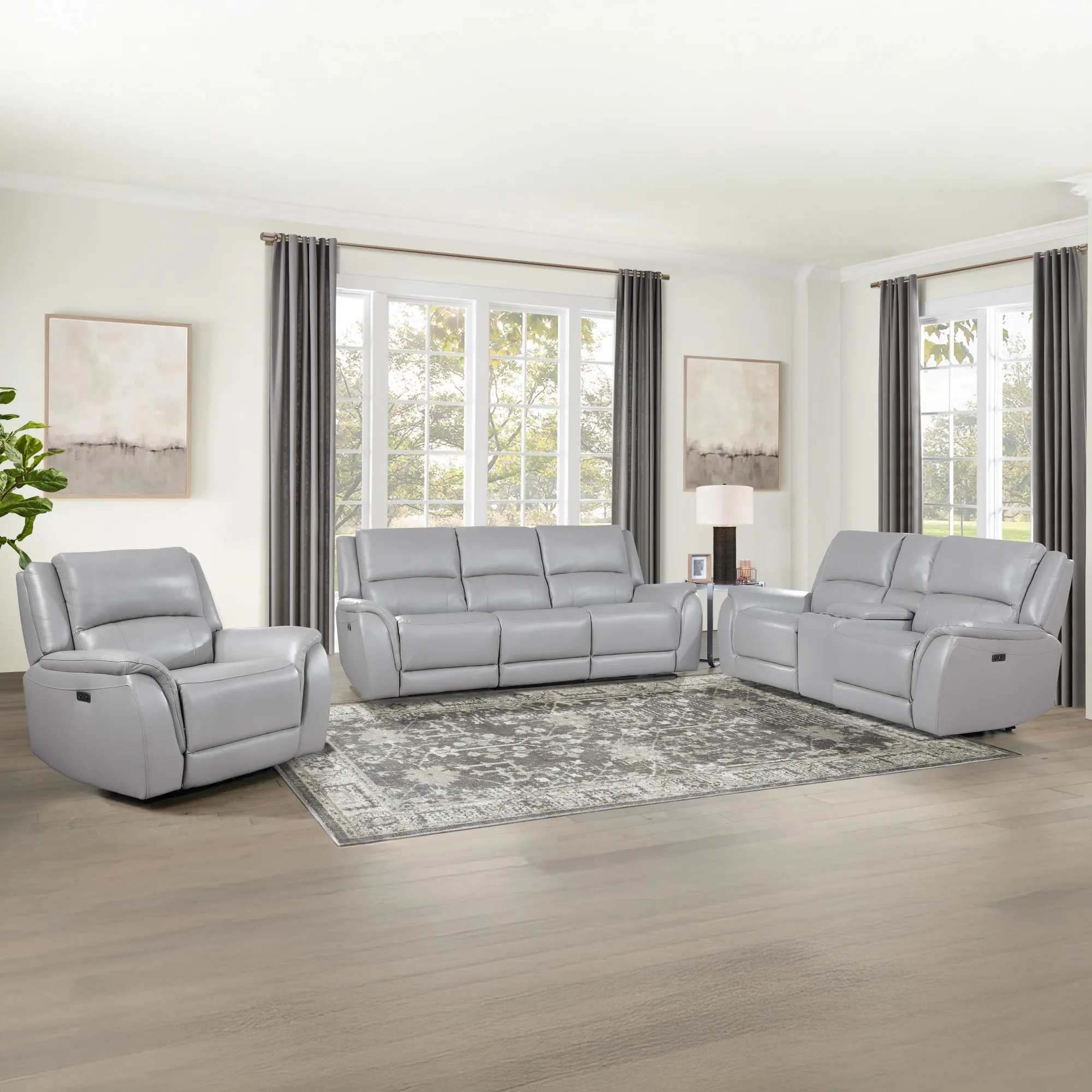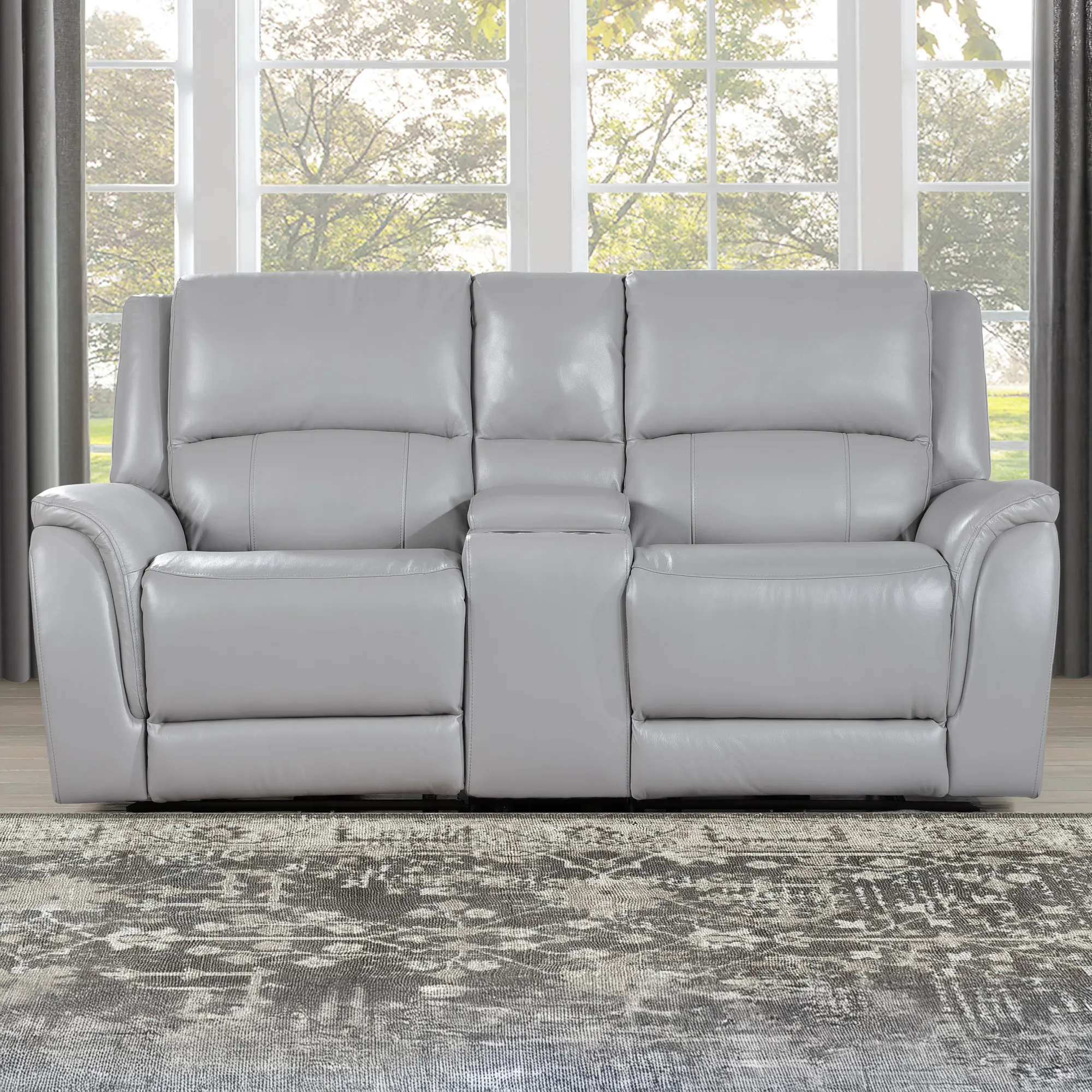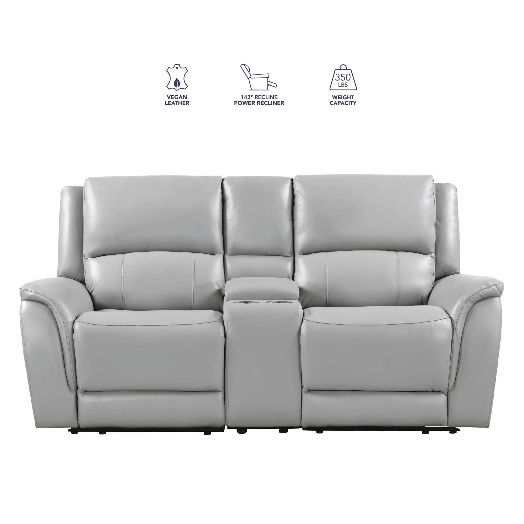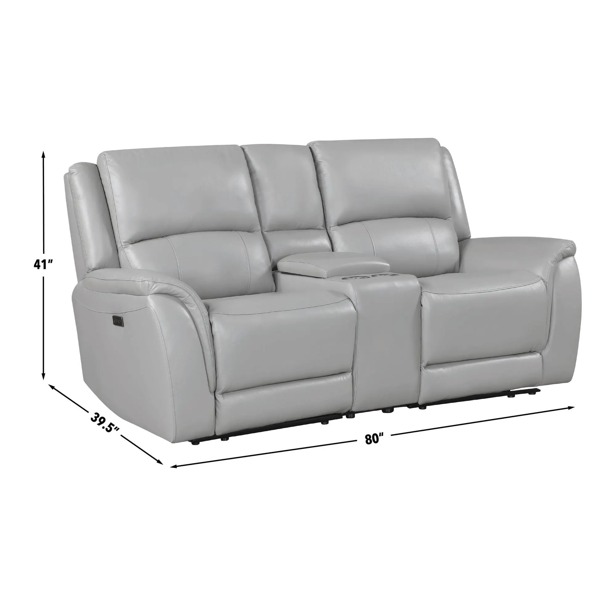 Embrace refined comfort with the Alexandria Leather Reclining Console Loveseat. Upholstered in cool, neutral Stone leather, it complements any decor with understated elegance. Enjoy a 143-degree power recline that works efficiently with just 3″ of wall clearance. Plush 7-inch cushions provide deep, supportive seating, while the center console adds practical storage. Stay connected with built-in USB ports. Designed for style and function, this loveseat brings modern convenience and timeless comfort together in one beautifully crafted piece.
