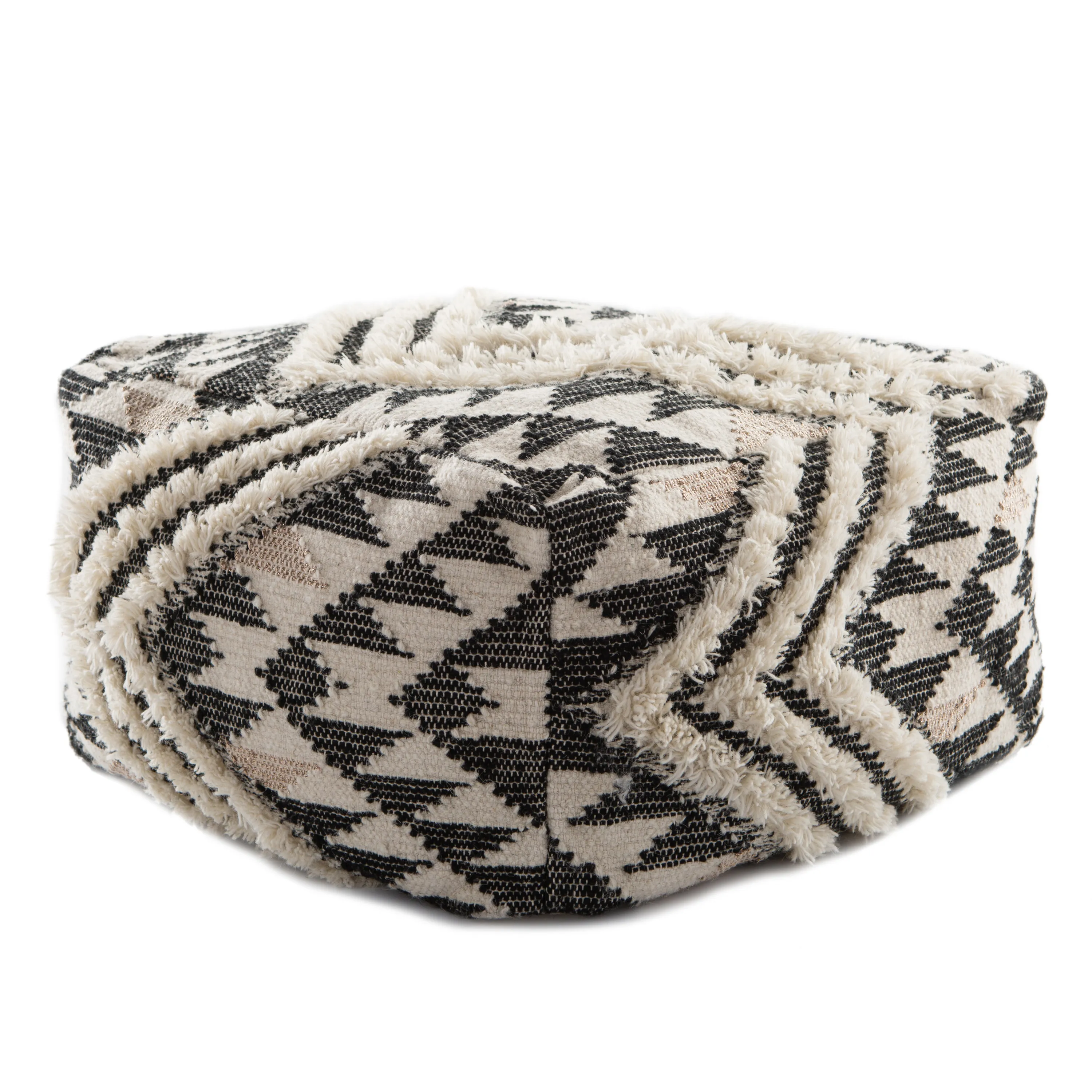 The Ultra collection designed by Nikki Chu brings bohemian charm to contemporary homes. The Nomadic pouf draws texture inspiration from traditional kilim rugs, adding a hint of glamour with the metallic, blush triangular accents. Crafted of wool, this chic ottoman offers a whimsical and worldly look to any living space.