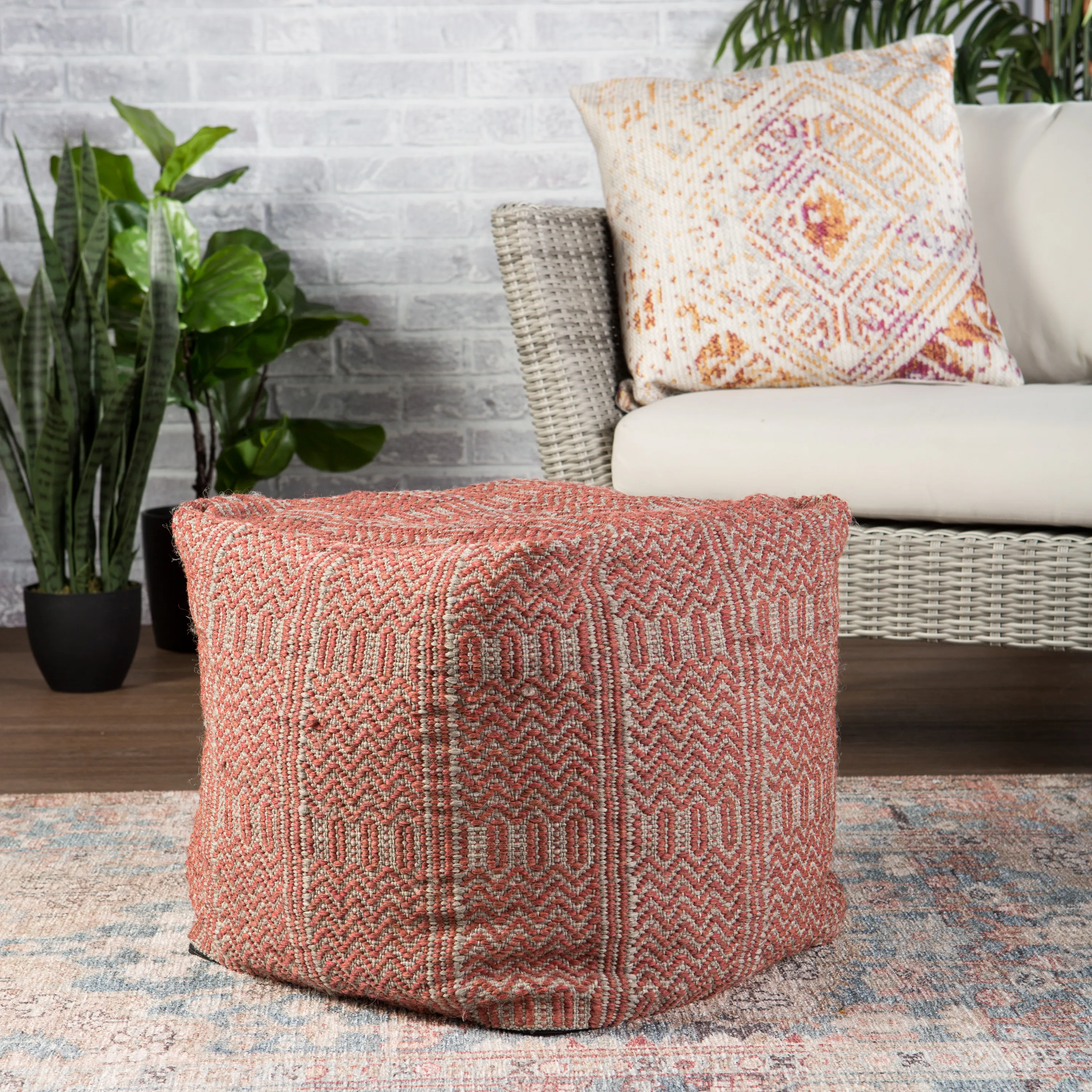 The Roanoke collection of poufs brings boho vibes to both indoor and outdoor spaces. The cube-shaped Destrie pouf features a durable polypropylene construction, perfect for weather-resistant use. This gray and red accent is woven with chevron and tribal details for a unique, textural touch.