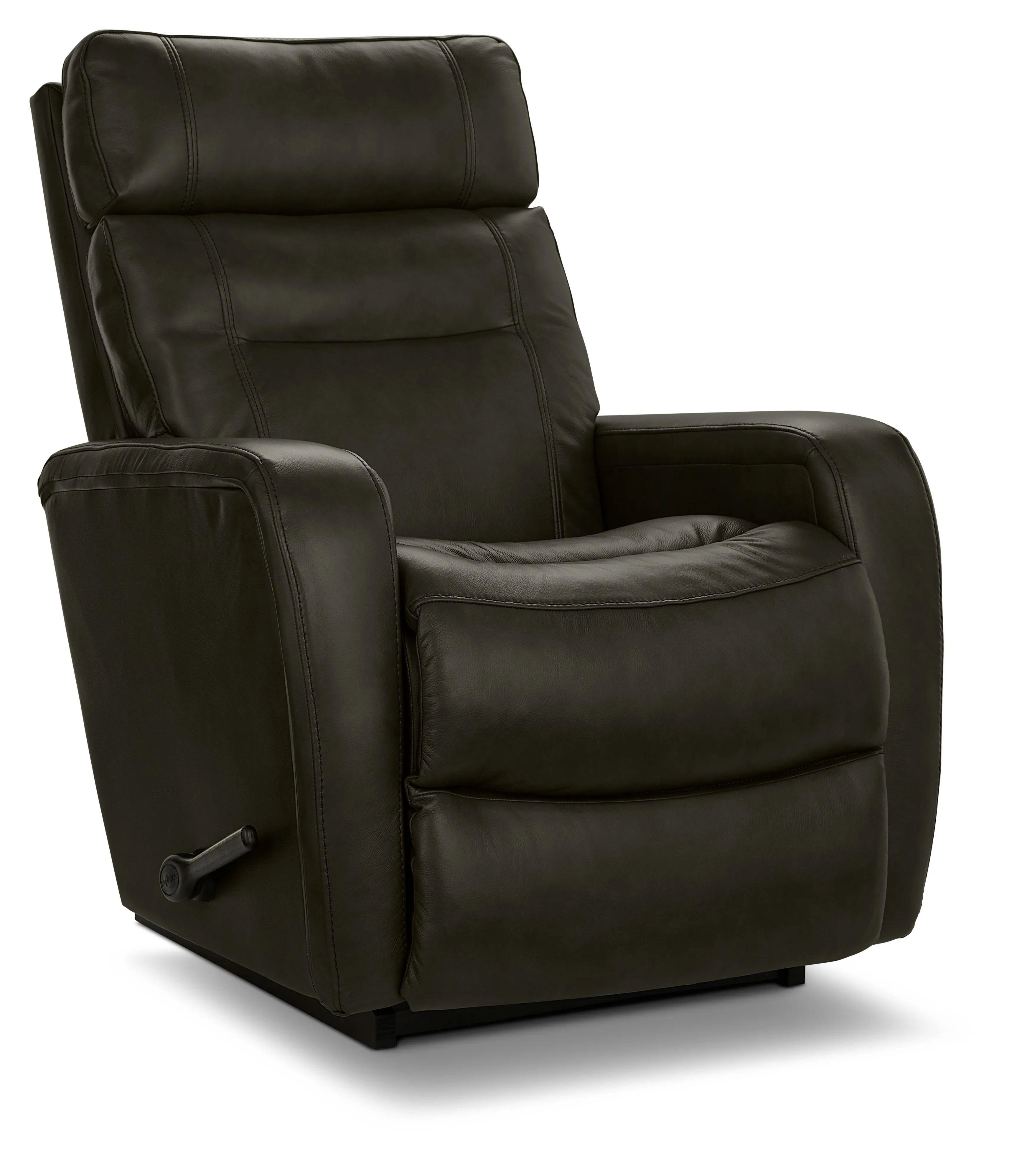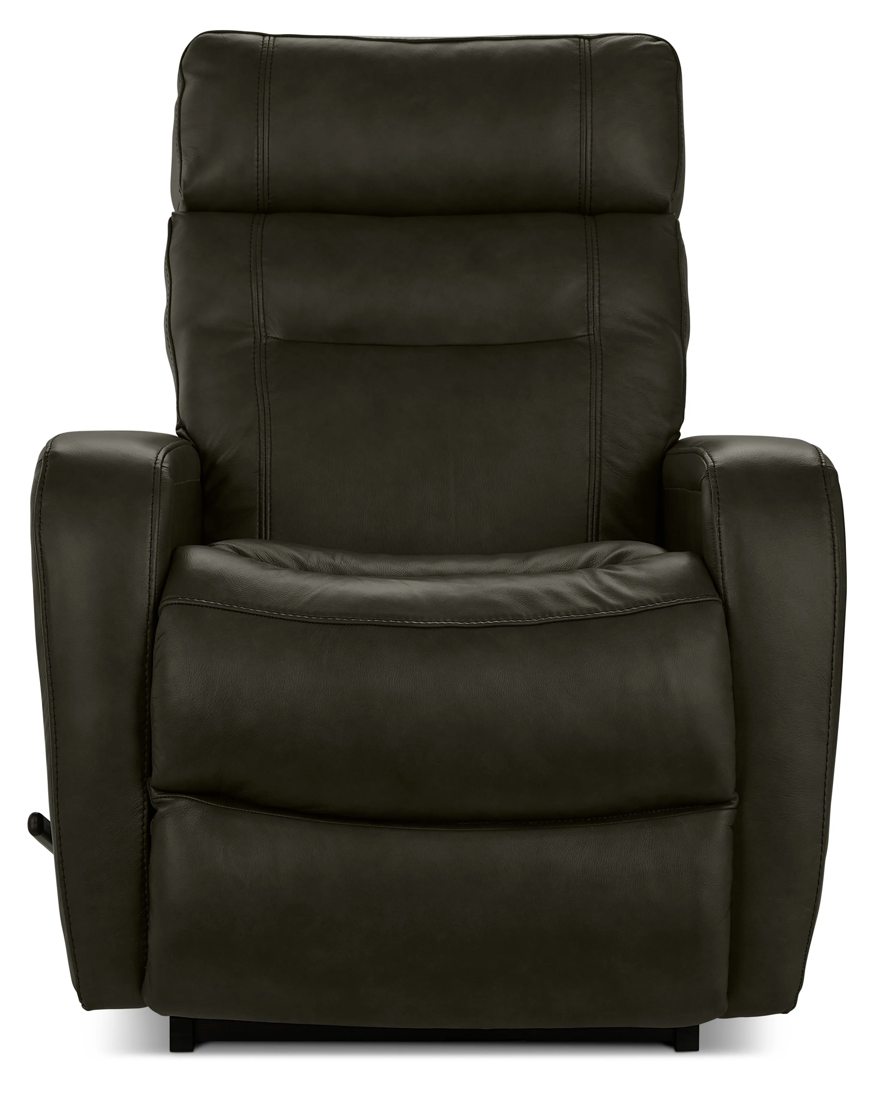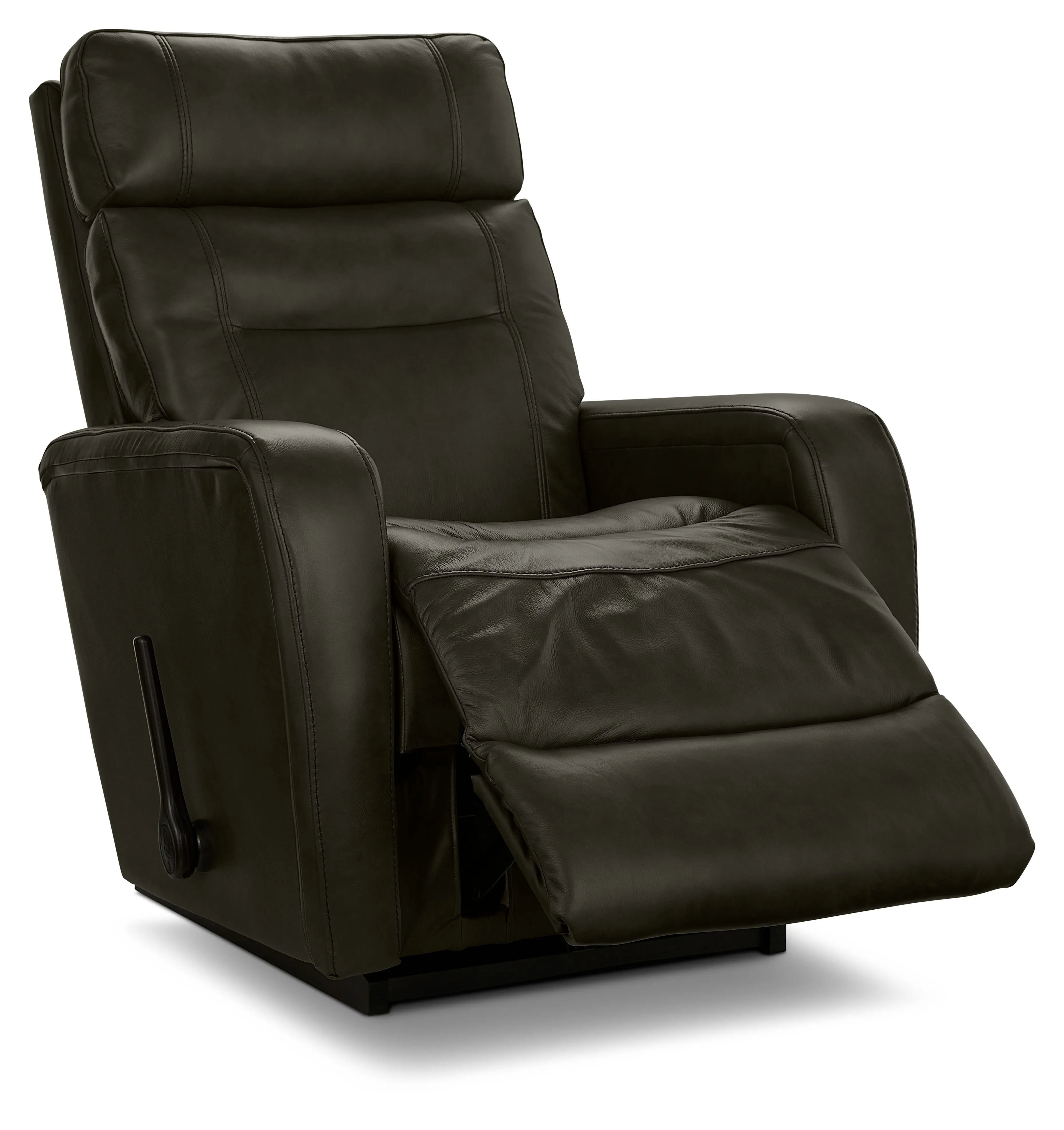 The Baron Rocking Recliner merges automotive-inspired design with soft comfort. Curving, tapered arms embrace a sculpted bucket chaise seat. Adjust the tall, tailored back and lift the legrest for cozy lounging. Or simply recline the back and rock.