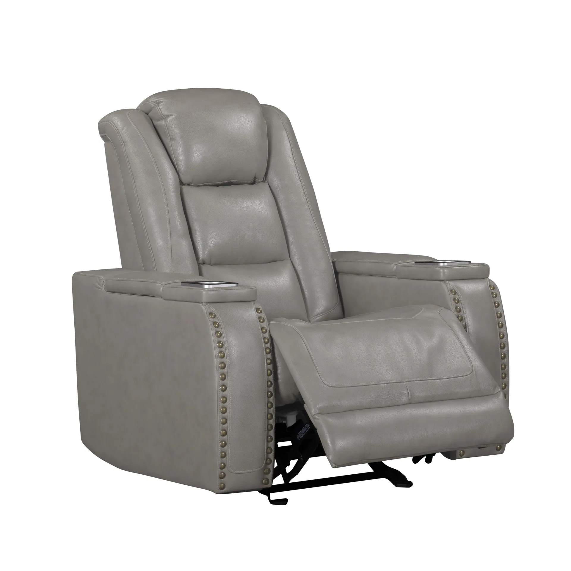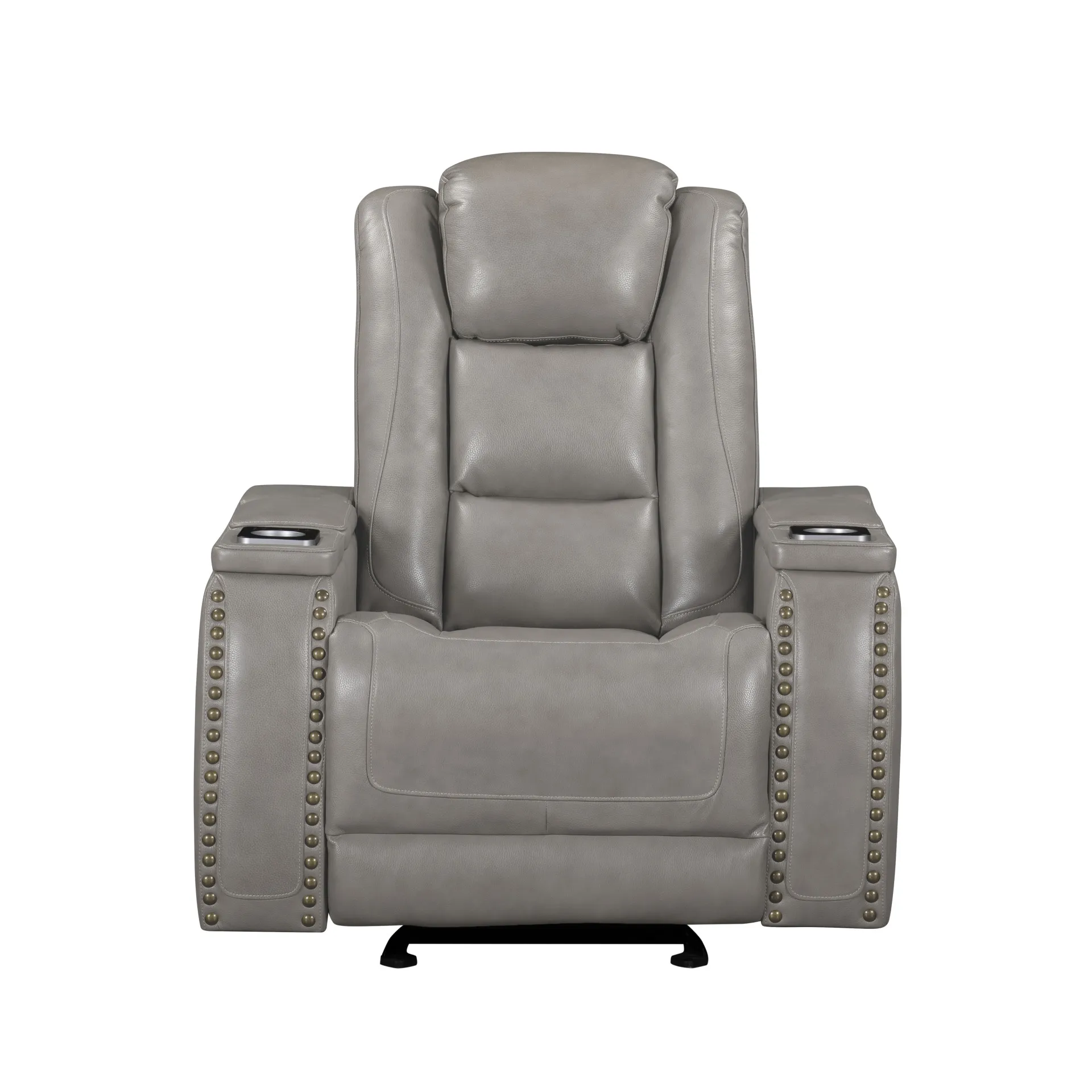 The Breckenridge Genuine Leather Power Glider Recliner with Adjustable Headrest in Gray offers a perfect blend of comfort, style, and practicality for any living space. This recliner is crafted with a combination of hardwood and manufactured woods, ensuring a durable and sturdy frame that provides long-lasting support. The top-grain leather where you touch—on the seat, arms, and footrest—offers a luxurious feel, while a matching leather-like material is used in other areas to maintain affordability without compromising on style or comfort. The transitional design, featuring clean lines and elegant nailhead trim, seamlessly blends traditional and modern elements, creating a versatile piece that complements any decor. Pocket coil seat cushions deliver superior comfort with targeted support, minimizing pressure points for a tailored seating experience. The power recliner and adjustable headrest allow you to effortlessly find your perfect position for lounging or reading with just the touch of a button. Additional conveniences like built-in wireless chargers and handy cupholders in the armrests ensure that everything you need is within easy reach, making this recliner a practical and stylish addition to your home.
