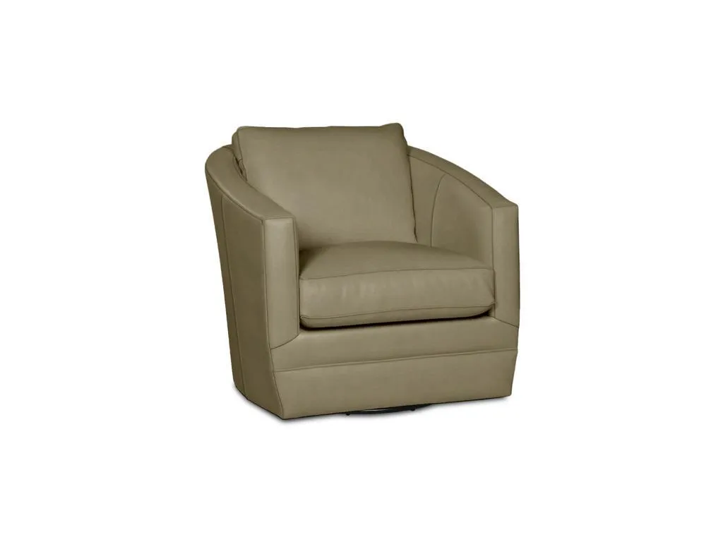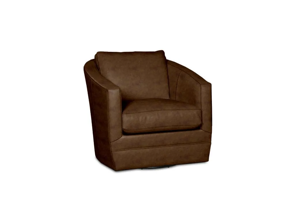 A modern barrel-back shape gives this comfy leather swivel glider a clean sophisticated look. It features track arms and an attached back pillow for easy maintenance. The plush down blend coil cushion means you'll never want to leave. Also available as a swivel chair as style number L063710BDSC