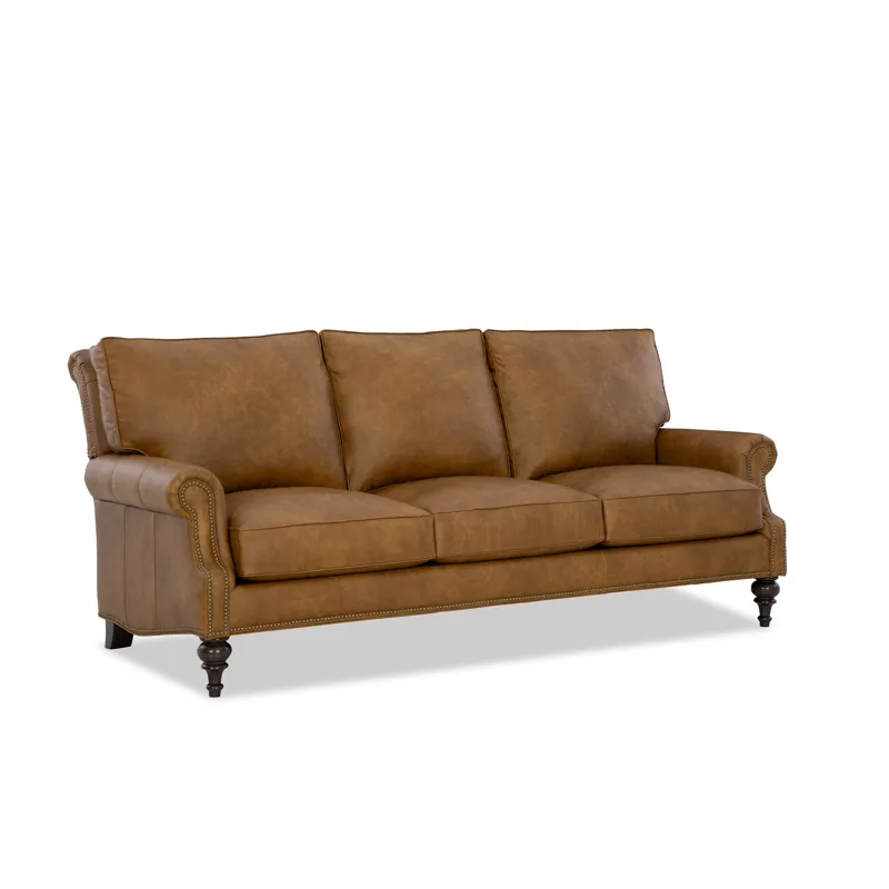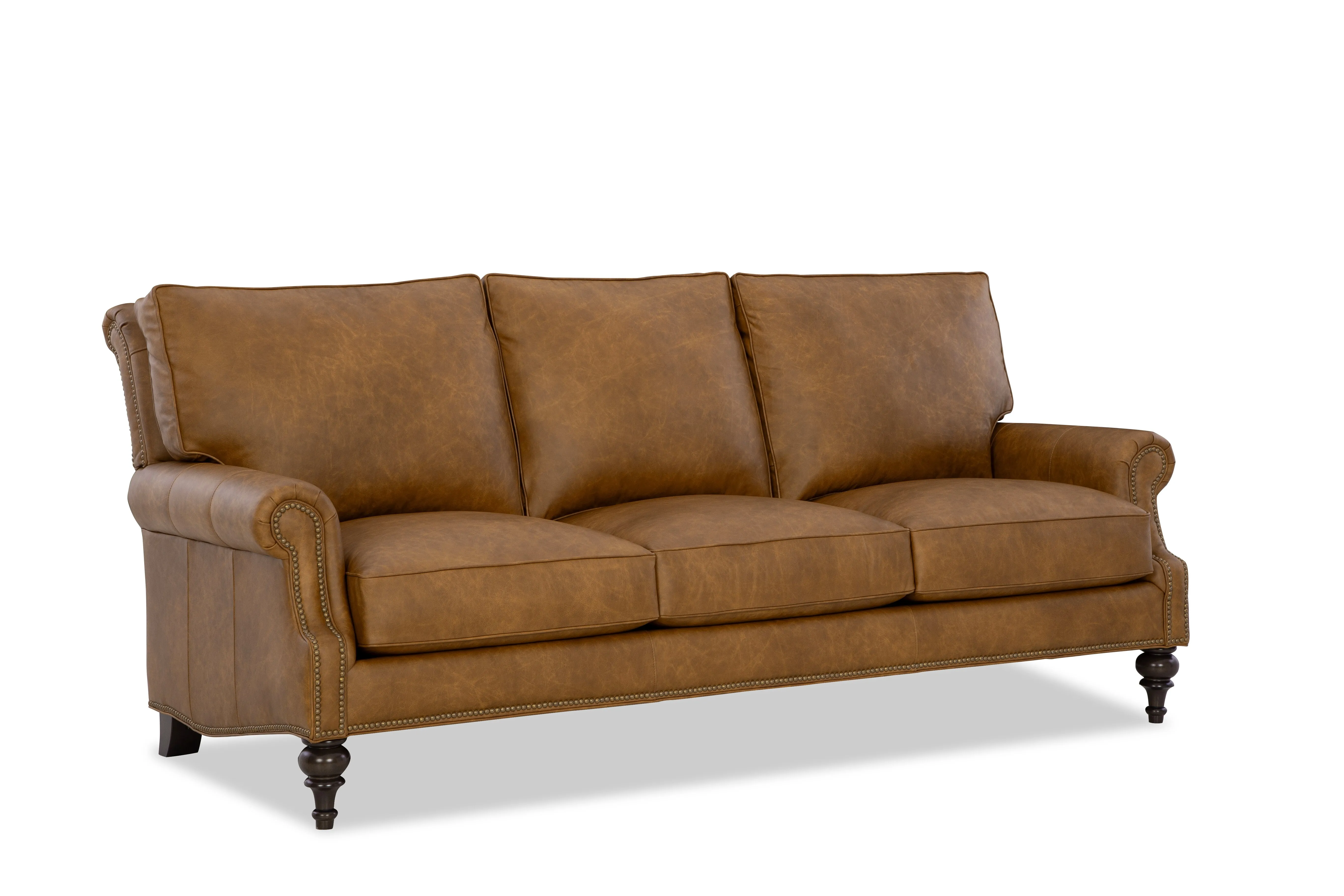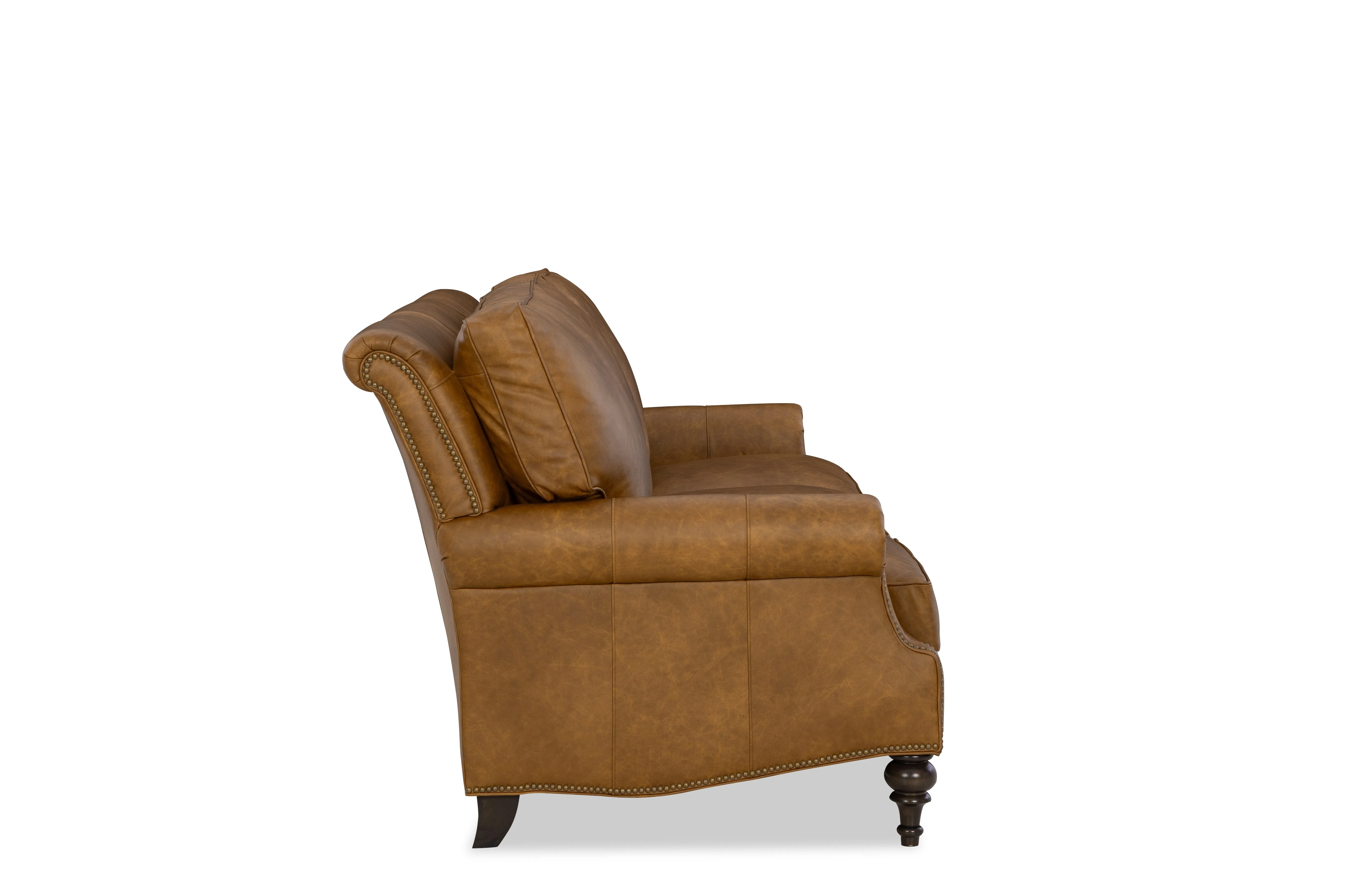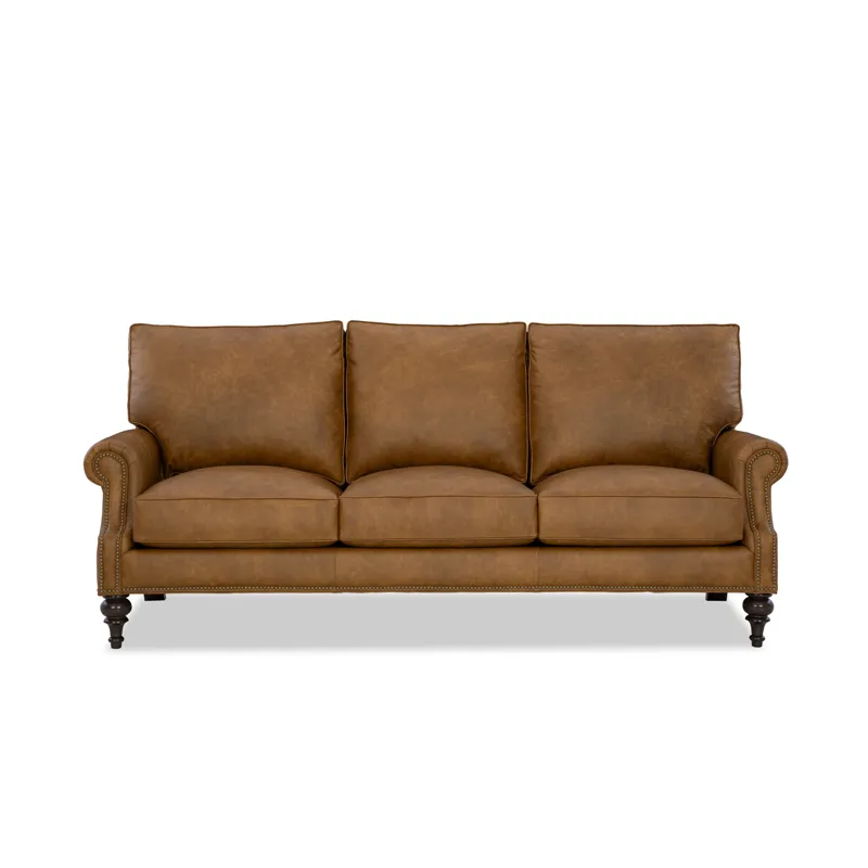 Classic traditional details and nail head trim accents are the things you'll notice first on this gracefully finessed leather sofa. It features a rollover back, cut-back rolled arms, and beautifully turned legs that offer a familiar heirloom touch. Attached box border back pillows and Blend Down Coil Seat Cushions. Optional nail finishes available. Also available are the matching loveseat, chair 1/2, and ottoman. Also available without nail head trim.
