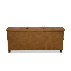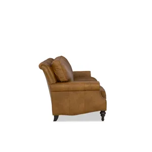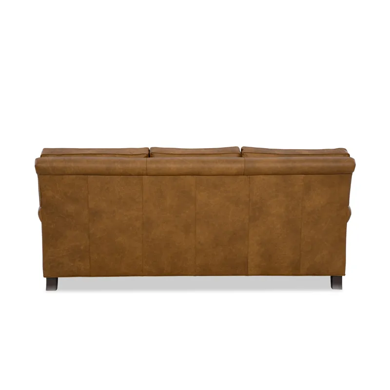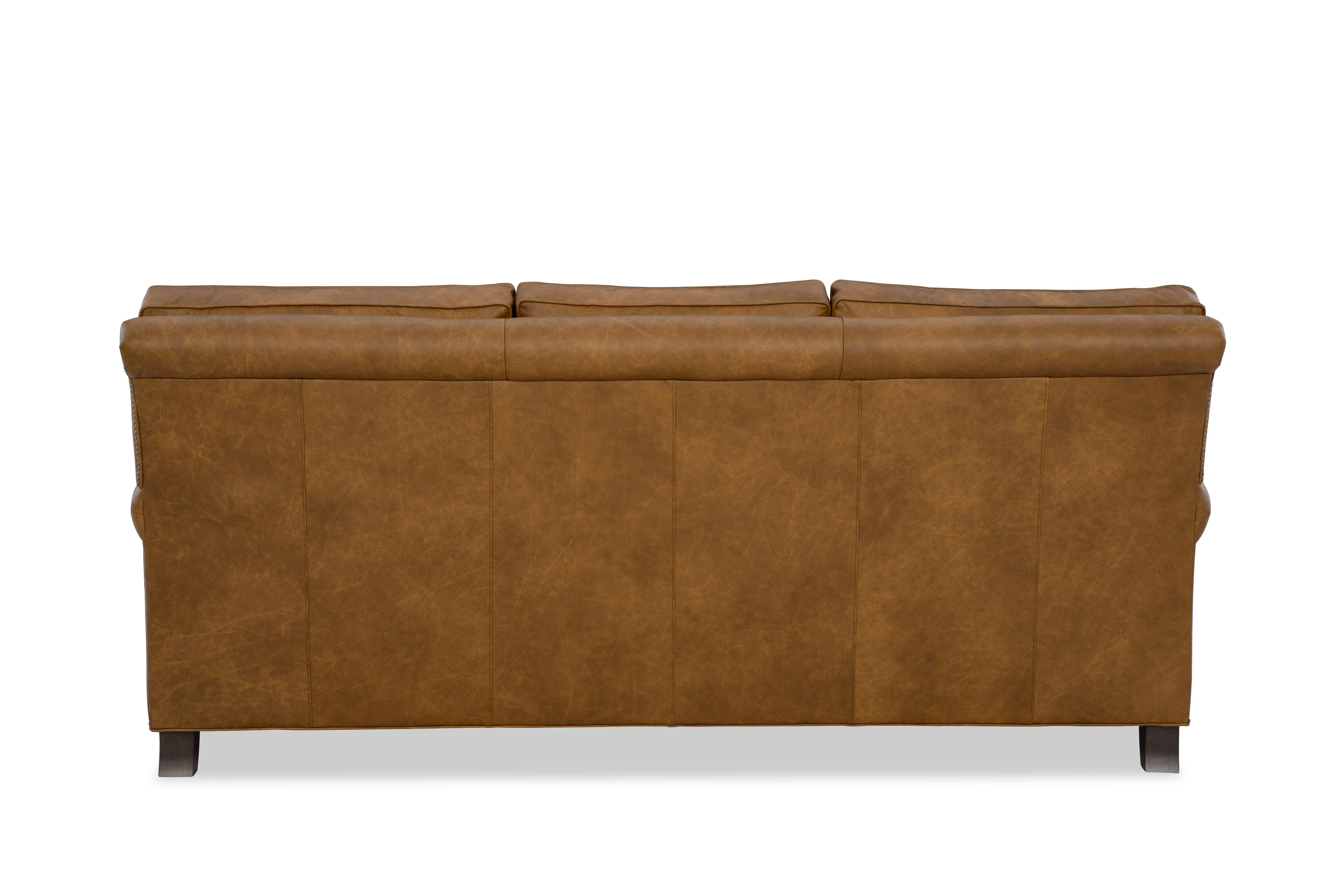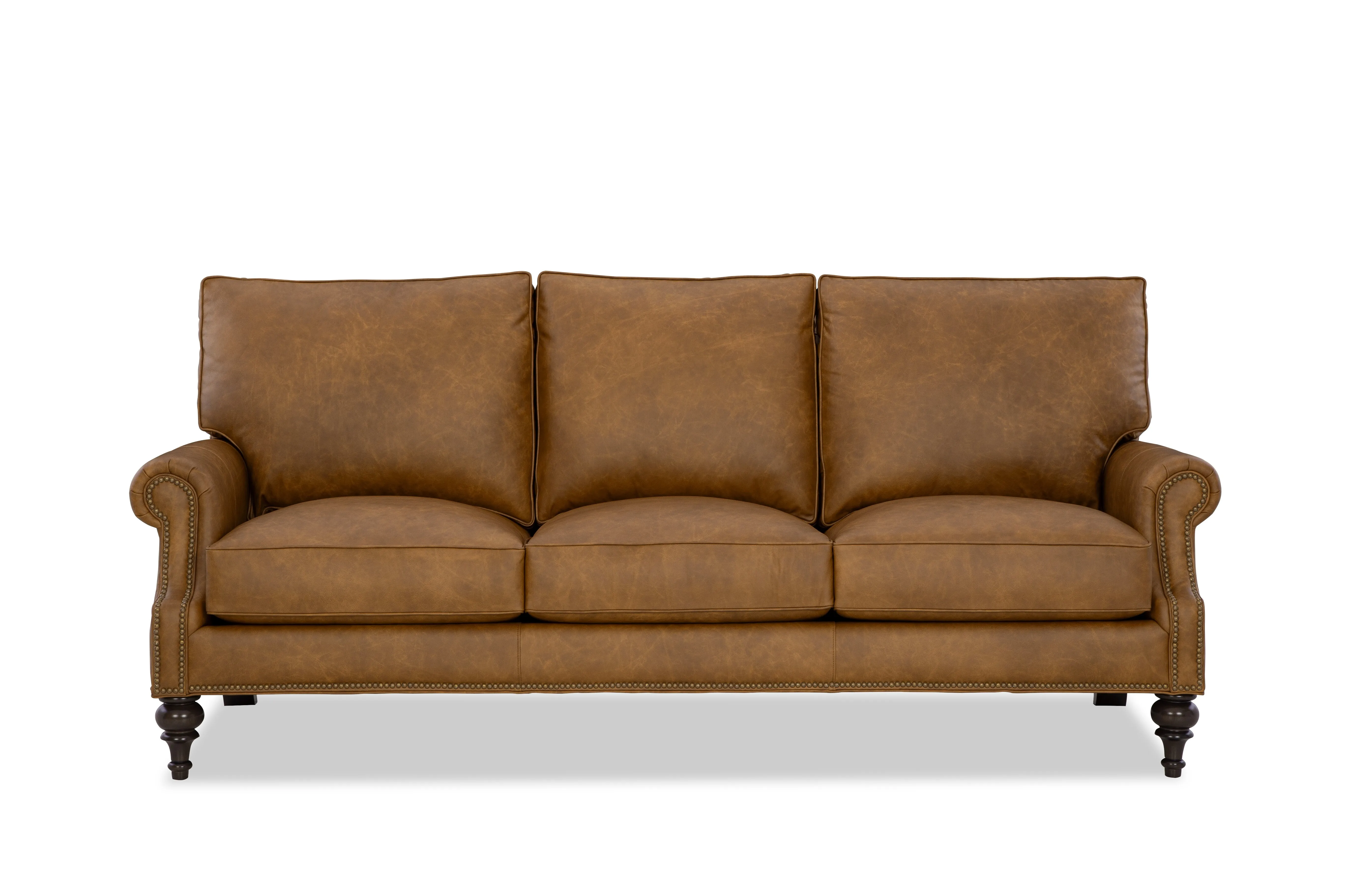 Classic traditional details and nail head trim accents are the things you'll notice first on this gracefully finessed leather sofa. It features a rollover back, cut-back rolled arms, and beautifully turned legs that offer a familiar heirloom touch. Attached box border back pillows and Blend Down Coil Seat Cushions. Optional nail finishes available. Also available are the matching loveseat, chair 1/2, and ottoman. Also available without nail head trim.