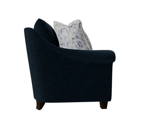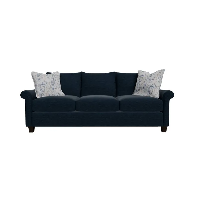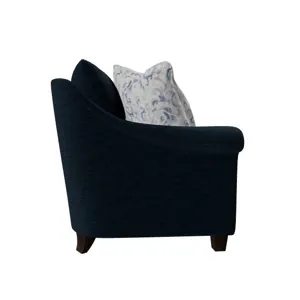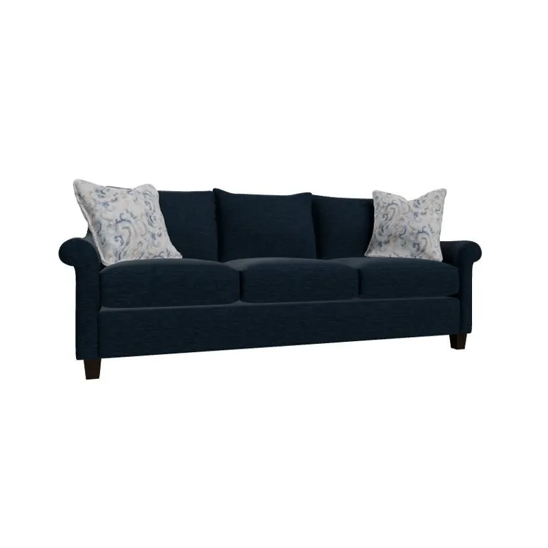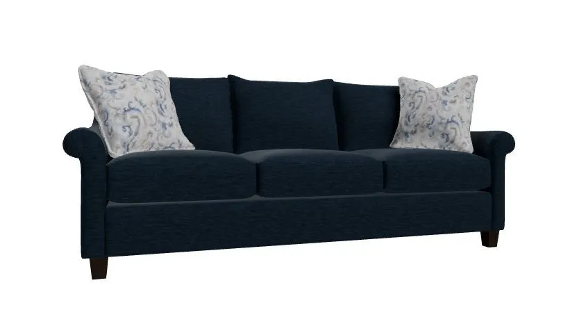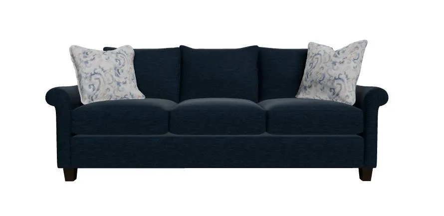 Understated and elegant, this sofa is beauty defined. It features slender sloping arms that taper from back to front and is finished with a pleated detail on the face. French seamed overall with knife-edge bed-pillow style back pillows. Blend Down seat cushion and flanged Blend Down toss pillows. Tapered legs. Also available are the matching loveseat, chair and ottoman.