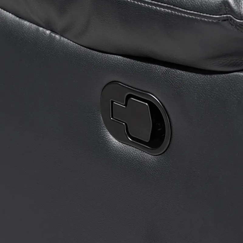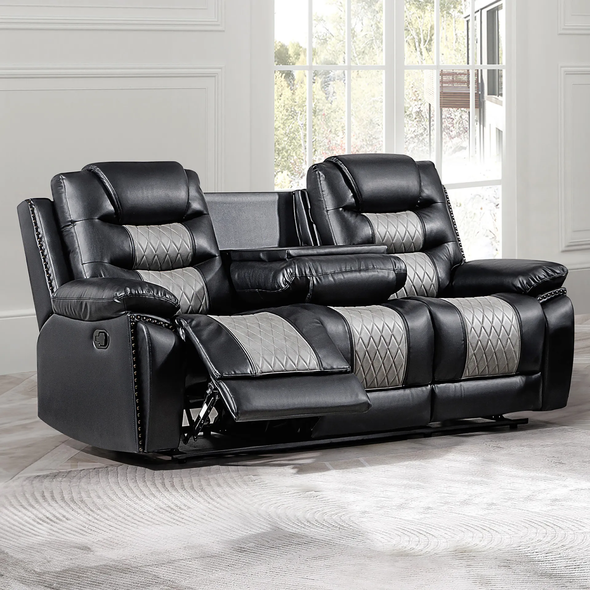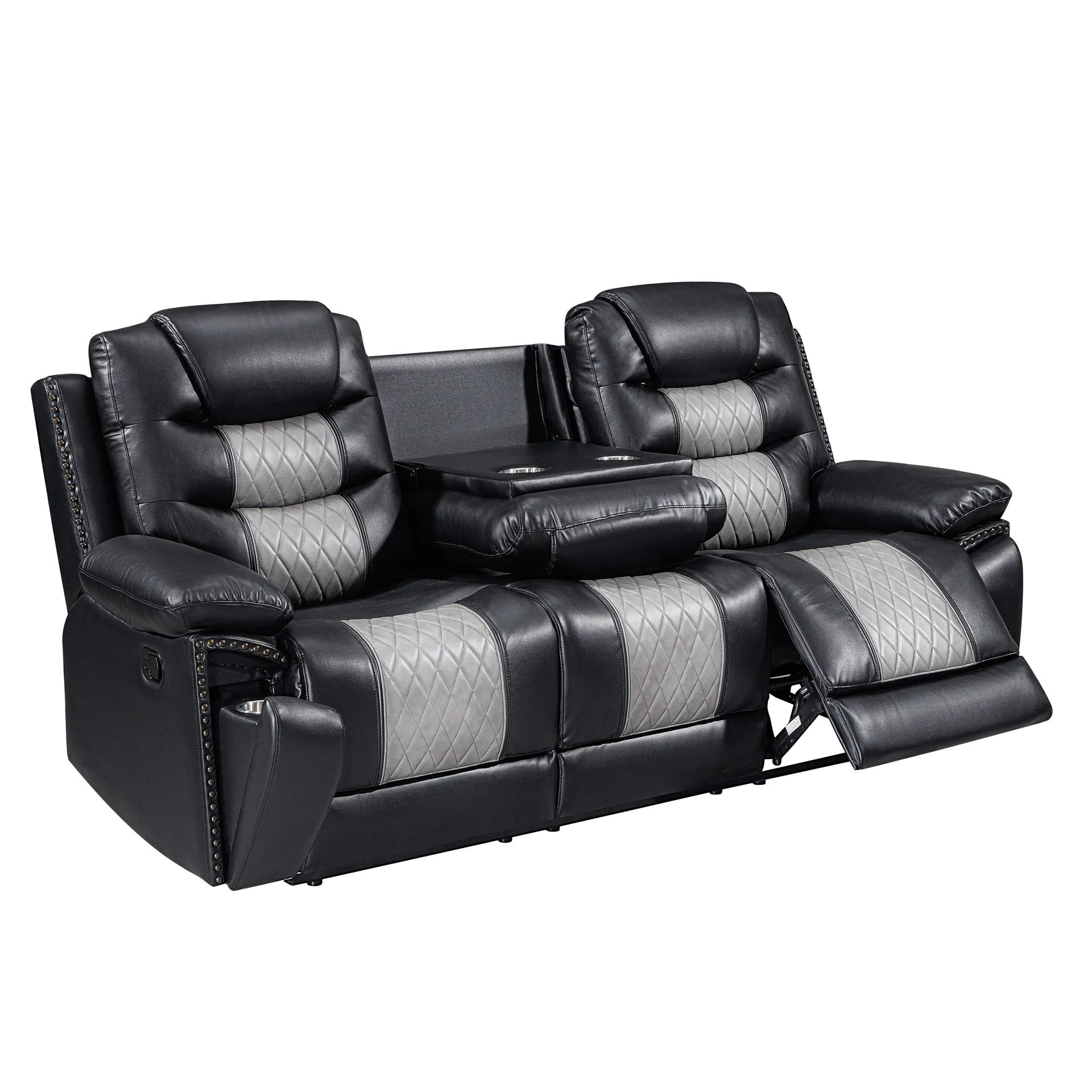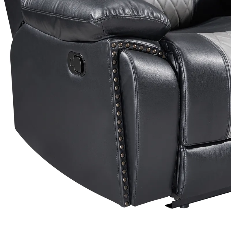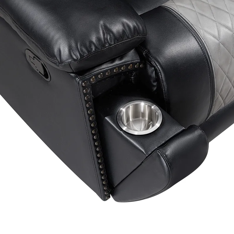 Enhance your living space with the Nikko Dual Recliner Sofa with Hidden Cupholders and Drop Down Snack Tray . This sofa, constructed with hardwood and plywood frames, promises long-lasting durability and stability. Luxurious comfort is ensured with resilient foam cushions and pocket coil support, providing a cozy place to lounge. The two-tone black and gray fabric, made from a blend of 80% polyester and 20% PU, offers the soft touch and look of leather while remaining breathable. Distinctive details such as nailhead trim, diamond stitch pattern seats, double wrapped headrests, and expert tailoring make this sofa stand out in any home. Enjoy practical lifestyle features like the center back cushion that conveniently drops down into a snack tray complete with beverage holders, and hidden pull-out cupholders discreetly housed under the armrests. Plush pillowed arm and headrests, reclining backs, and comfortable footrests provide the perfect place to unwind. Upgrade your living room with the Nikko Dual Recliner Sofa and experience unparalleled comfort and style.