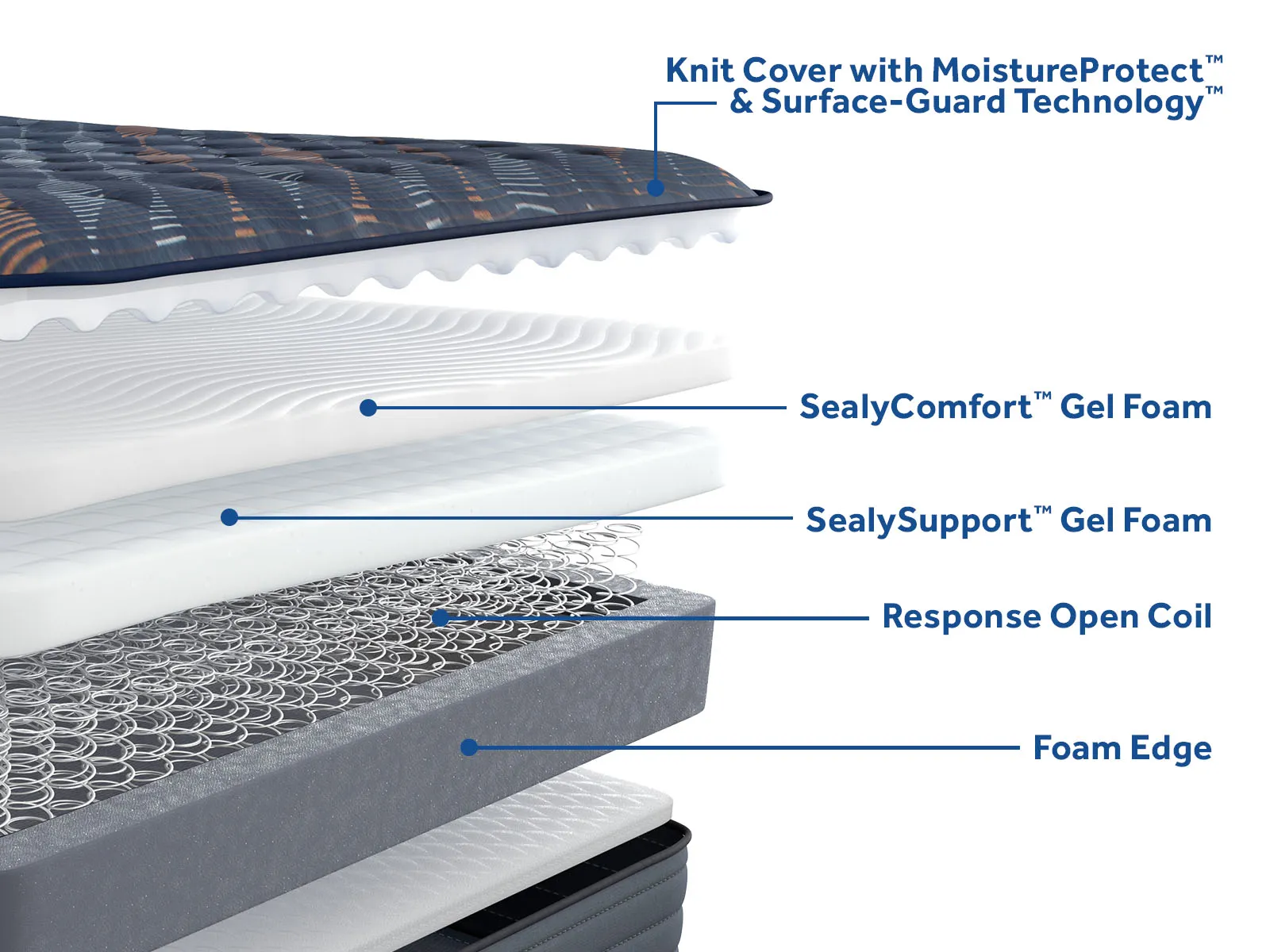 Layers of Sealy® gel foams combine with precisely engineered open coils to deliver flexible, breathable, personalized comfort with conforming support and a “not too firm but not too soft” medium feel.