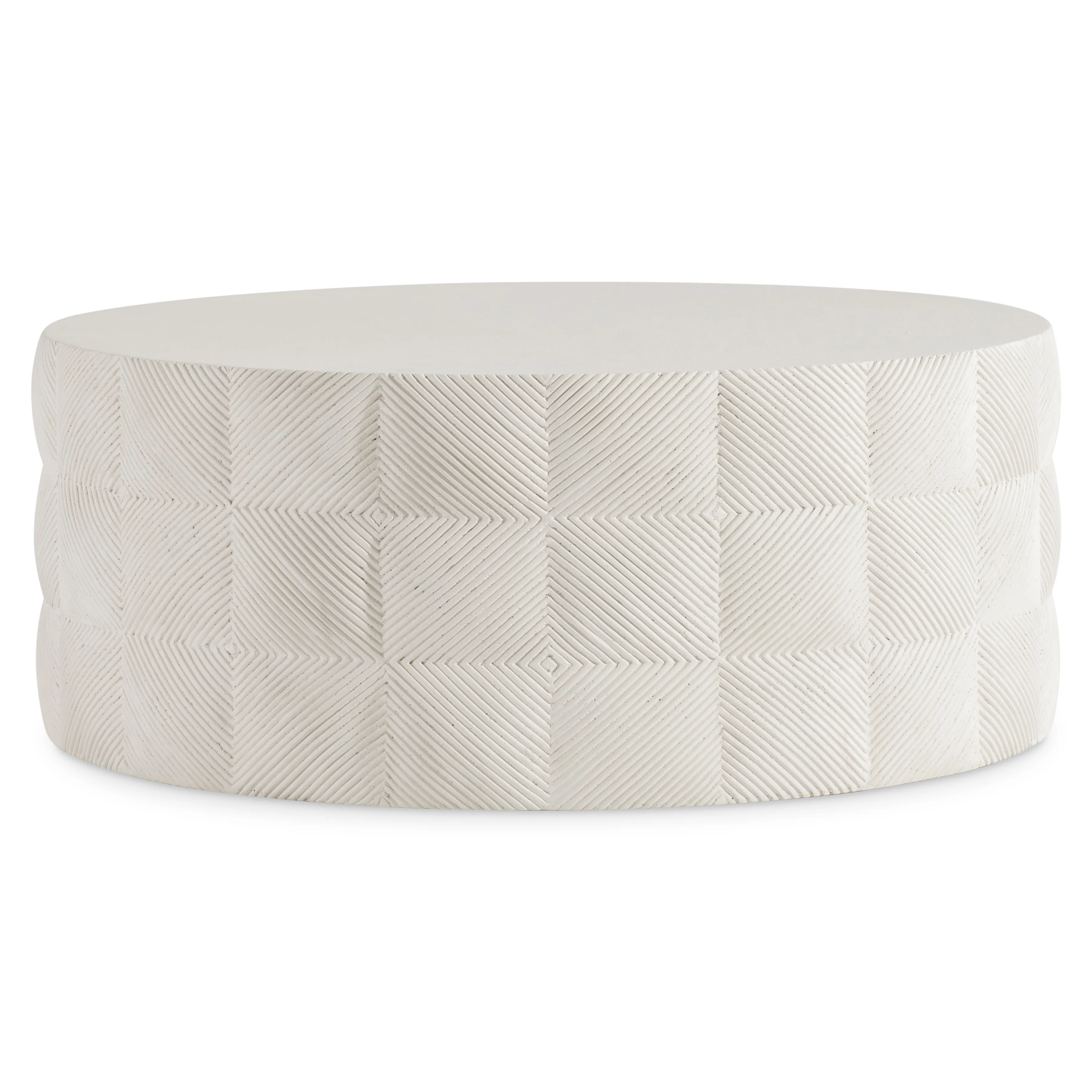 Stonecast gives the Ballantyne cocktail table its form and glow, as well as the ability to withstand the elements. Texture finds a new form on the sides, with the look of a woven rattan pattern.