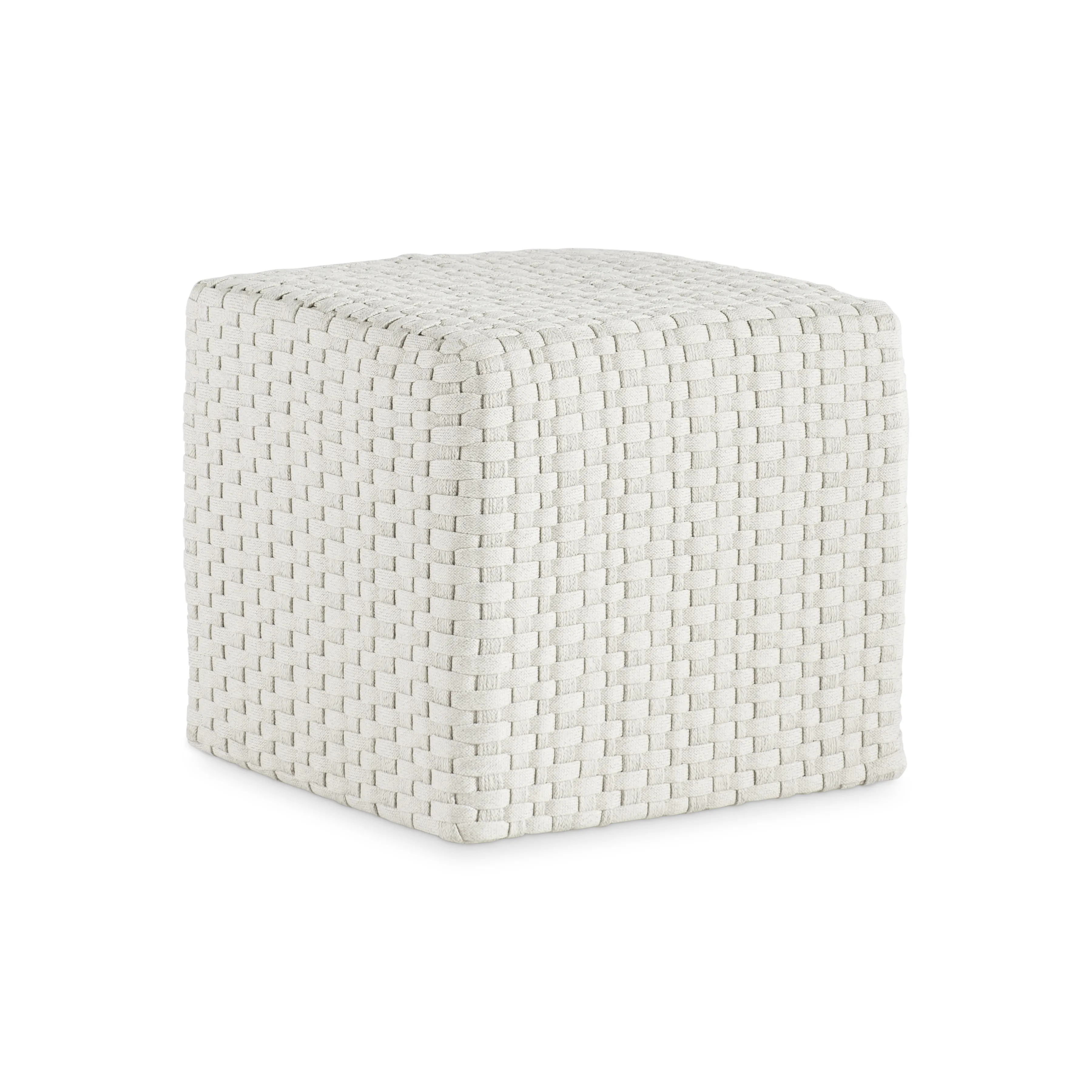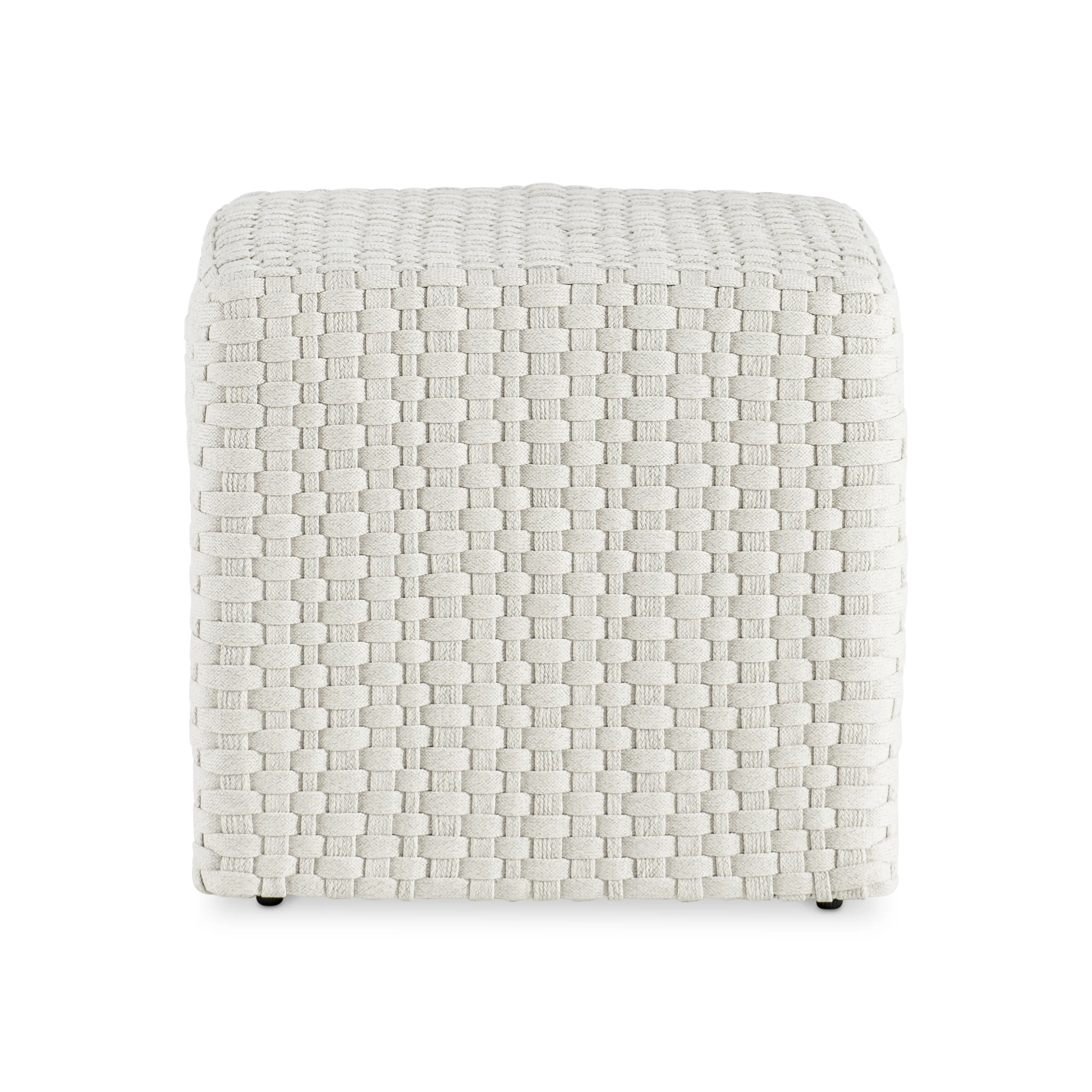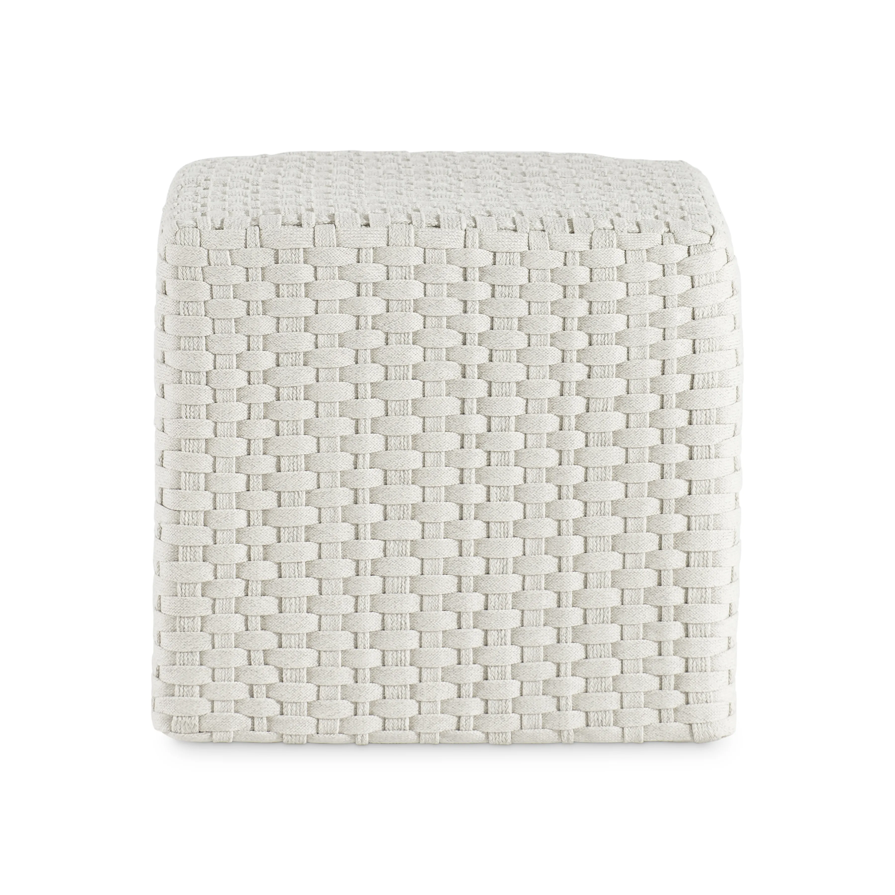 A basketweave pattern gives texture and style to the Boca outdoor ottoman. The traditional woven technique takes a more modern multifunctional approach with a cube shape that can be used as a stool or extra seat.